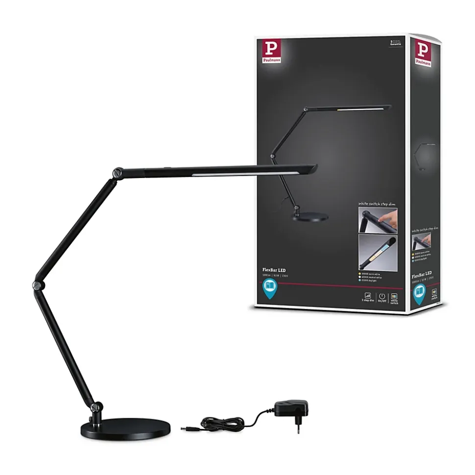 La lampe de bureau LED FlexBar Noir est dotée d’une maniabilité maximale grâce à trois articulations et peut éclairer une zone étendue. La température de couleur est réglable sur trois niveaux grâce à la fonction White Switch et l’intensité de la lumière est réglable grâce au gradateur tactile.