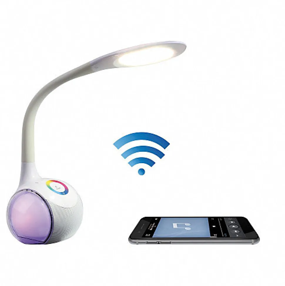 PING vous propose :Une lampe LED avec haut-parleur d’une puissance de 5W. Elle est compatible Bluetooth (portée jusqu’à 10 mètres) et a un microphone intégré, ce qui permet de répondre aux appels téléphoniques en mains libres.Vous pouvez brancher via le port USB une source de musique compatible avec le format MP3 et ainsi profiter de vos morceaux préférés sur cette lampe LED.Ce port permet aussi de recharger tous types d’appareils USB.Avec le contrôle tactile, vous pouvez régler l’éclairage en 3 intensités différentes et de différentes couleurs changeantes.Le bras en silicone est flexible, ce qui permet de régler la lampe à votre guise.Les plus-produits :- Eclairage doux, moyen et soutenu – Contrôle tactile- Microphone intégréCaractéristiques générales :- Haut-parleur 1 x 5 watts (ø 52mm)- Bluetooth V4.2- Microphone intégré (fonction mains-libres)- LEDs multicolores avec variateur de couleurs 3 niveaux de luminosité par bouton tactile : fort, normal, doux- Température couleur : 5500~6500k- RGB 256 couleurs / Lumen max.: 300 Lumens- Lumière douce pour les yeux- Touches tac