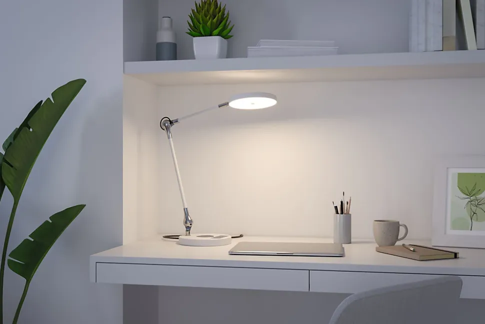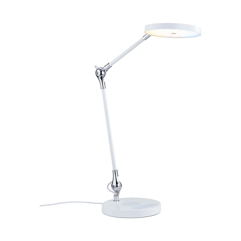 Le luminaire de bureau Numis Qi est vraiment polyvalent ! Son blanc intemporel est très beau sur un bureau. La position peut être précisément définie à l’aide des deux articulations. Sur le pied du luminaire se trouvent plusieurs commandes, dont la gradation en continu de la lumière ainsi que le choix entre blanc chaud et blanc lumière du jour. Le pied sert aussi de station de charge sans fil pour les smartphones avec fonction Qi.