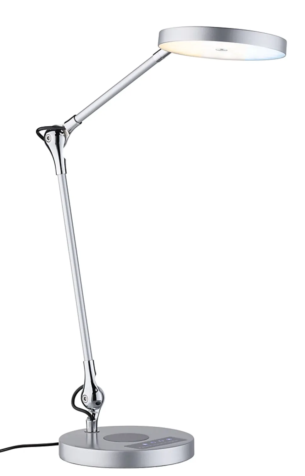 Le luminaire de bureau Numis est polyvalent ! Son coloris Argent intemporel est très beau sur un bureau. Sa position peut être précisément définie à l’aide des deux articulations. Sur le pied du luminaire se trouvent plusieurs commandes, dont la gradation en continu de la lumière ainsi que le choix entre blanc chaud et blanc lumière du jour.