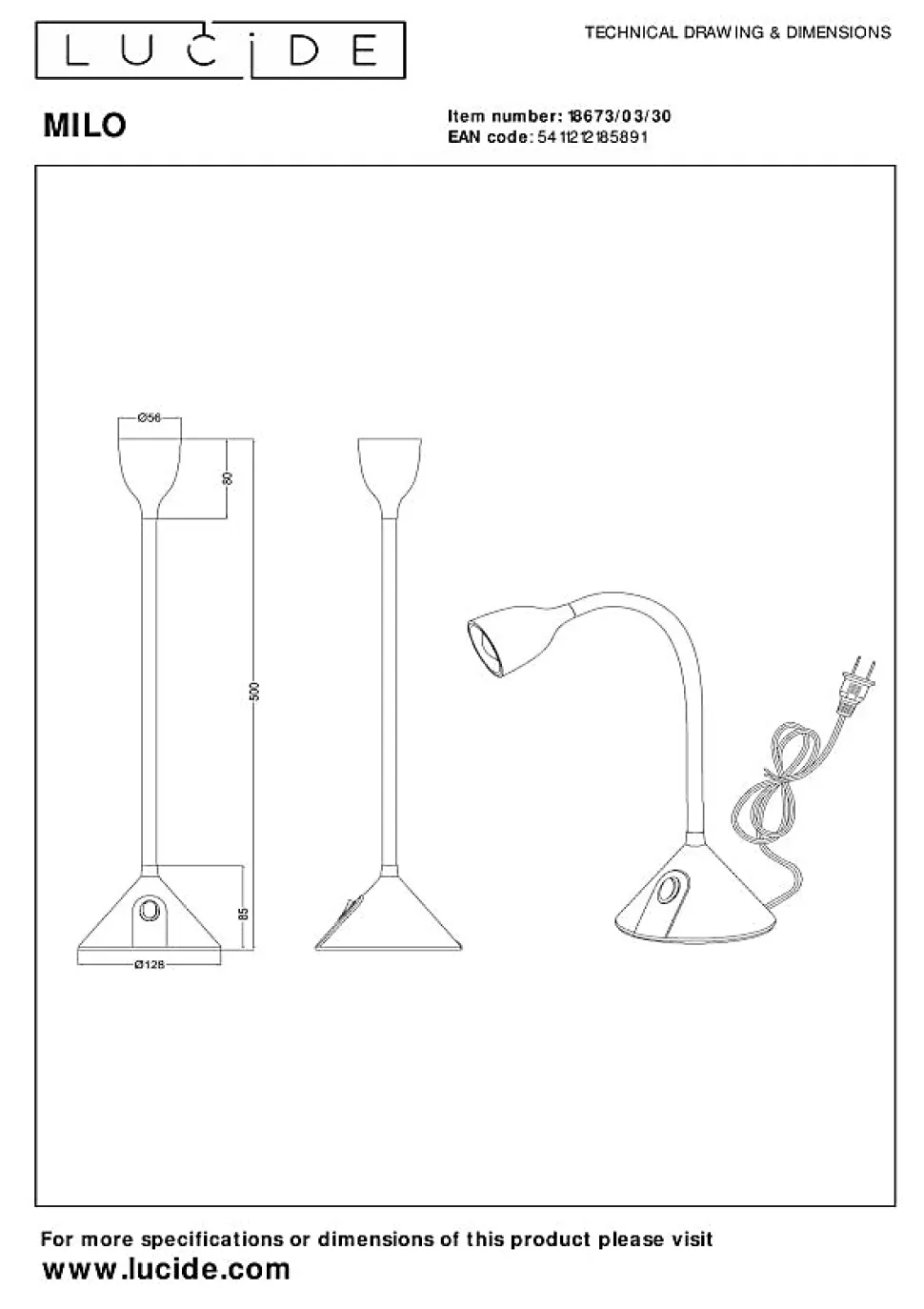 Plus d’excuses pour ne pas se concentrer que ce soit en étudiant ou en lisant. Avec Milo, votre productivité atteint un point culminant. Cette lampe de bureau fait ce qu’il faut : éclairer votre esprit. Et Milo fait cela brillamment avec sa lampe LED intégrée qui diffuse une lumière vive de 3 000 K. Cette lampe est réglable en hauteur et équipée d’un bras de lecture flexible. Grâce à cela vous amènerez le faisceau lumineux d’une manière fluide dans la bonne position. Marquer des points n’a jamais été aussi simple avec Milo à vos côtés.Caractéristiques uniques:• Équipé d’une lampe LED intégrée• Dispose d’une lumière blanche chaude (3000K)• Avec un bras de liseuse flexible• Avec un interrupteur On/off sur la lampe• Fabriqué en absPrincipales caractéristiques du produit:• Consommation énergétique: 1×3,2W / 220V / Sans intensité variable (Ampoule incluse)• Dimensions: Ø12,8 cm Haut.50 cm• 3 Ans garantie sur le luminairePourquoi choisir l’éclairage Lucide?Lucide incarne un design innovant, un savoir-faire artisanal et une fiabilité exemplaire. En tant qu’entreprise familiale belge avec plus de trois décennies d’expertise, nous concevons des éclairages de haute qualité qui enrichissent et transforment chaque espace, tant intérieur qu’extérieur. Notre collection polyvalente comprend des luminaires durables et des sources lumineuses économes en énergie, soigneusement conçus par nos propres experts et fabriqués selon les normes CE les plus strictes. Grâce à notre large gamme, nous vous proposons toujours une solution d’éclairage adaptée, quel que soit le style ou l’espace. Ainsi, nous illuminons non seulement votre espace de vie mais aussi votre processus de choix dans la recherche d’un éclairage de qualité et abordable. Chez Lucide, nous combinons innovation et savoir-faire pour un éclairage qui ajoute non seulement de l’ambiance, mais transforme chaque maison en foyer.