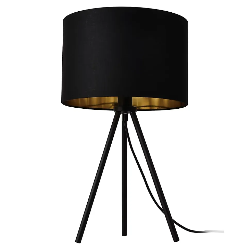 - Matière : – pieds et armature : métal – abat-jour : tissu Couleur : – côté extérieur de l’abat-jour : noir – côté intérieur de l’abat-jour : doré – pieds : noir