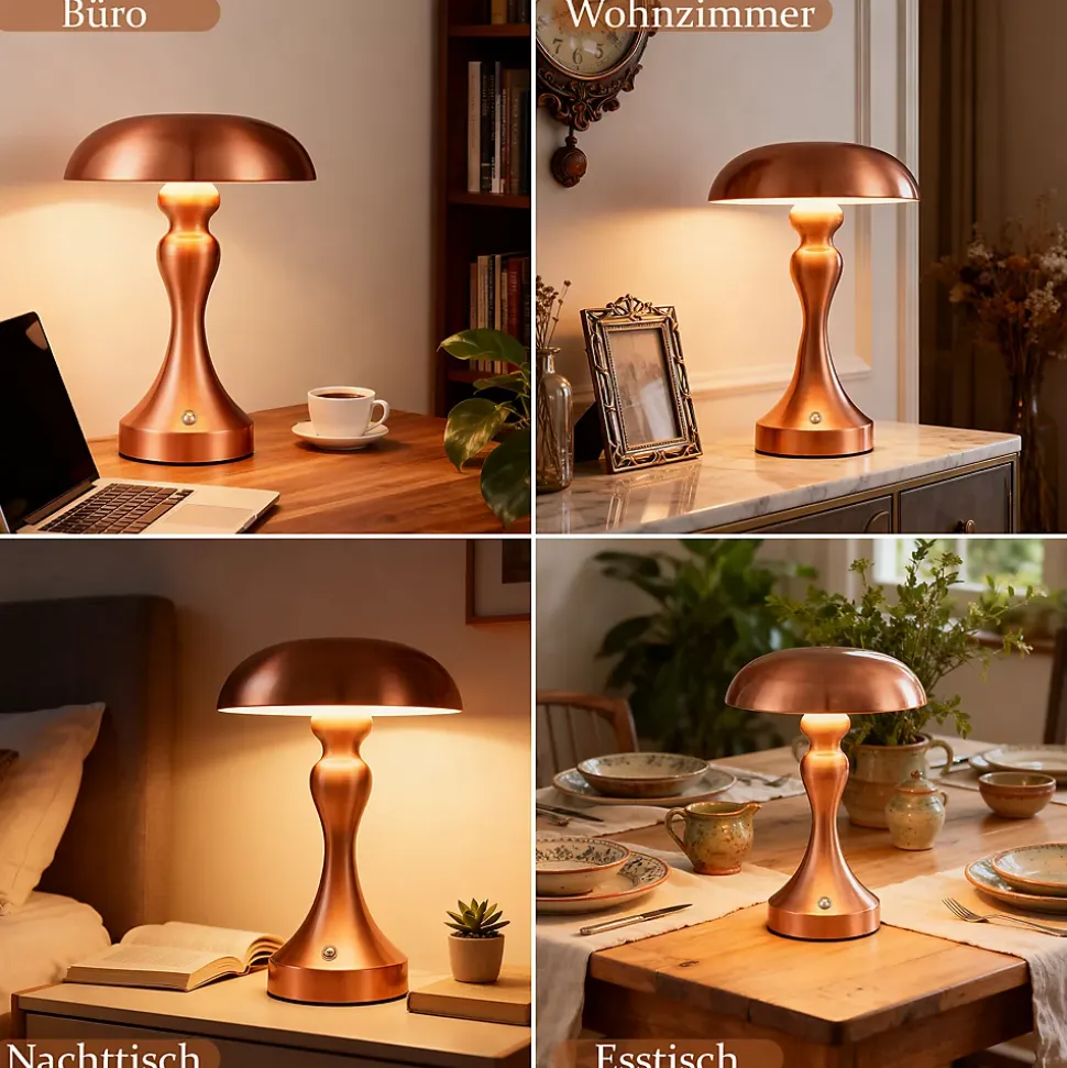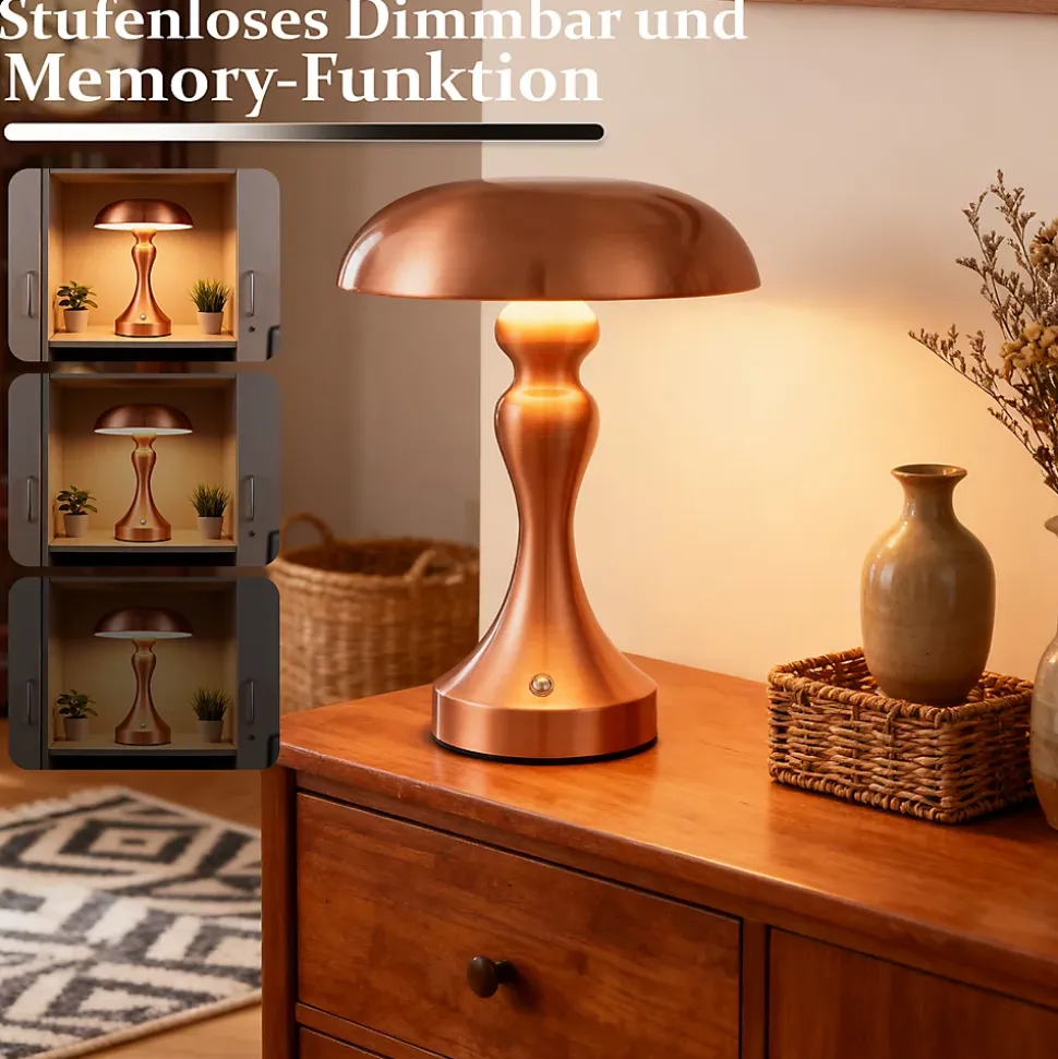 Contrôle tactile facile : cette lampe de table LED est équipée d’une fonction tactile conviviale qui vous permet de régler la couleur de la lumière (3000-6500K) et la luminosité (0-100%) d’un simple toucher. Parfait pour ajuster la lumière à vos besoins.Portable et rechargeable : la lampe à batterie rechargeable peut également être utilisée pendant la charge. Une fois chargé, vous pouvez l’utiliser de manière flexible et pratique n’importe où dans la maison. Un éclairage de secours idéal pour les situations d’urgence.Lampe de chevet LED efficace : avec une batterie au lithium intégrée de 1800 mAh, la lampe fonctionne jusqu’à 6 heures après une charge complète. La charge ne prend que 3 heures, grâce au câble de charge USB Type-C inclus.Utilisations polyvalentes : cette lampe champignon à piles s’intègre parfaitement dans n’importe quel environnement, que ce soit dans la chambre, le salon, la salle à manger ou même dans un bar. Le design rétro crée une atmosphère unique.Conception portable classique : avec une hauteur de 22 cm, il s’adapte à n’importe quelle table et armoire. Disponible en trois couleurs (nickel, bronze rouge et bronze doré), il peut s’adapter à différents styles de votre maison.