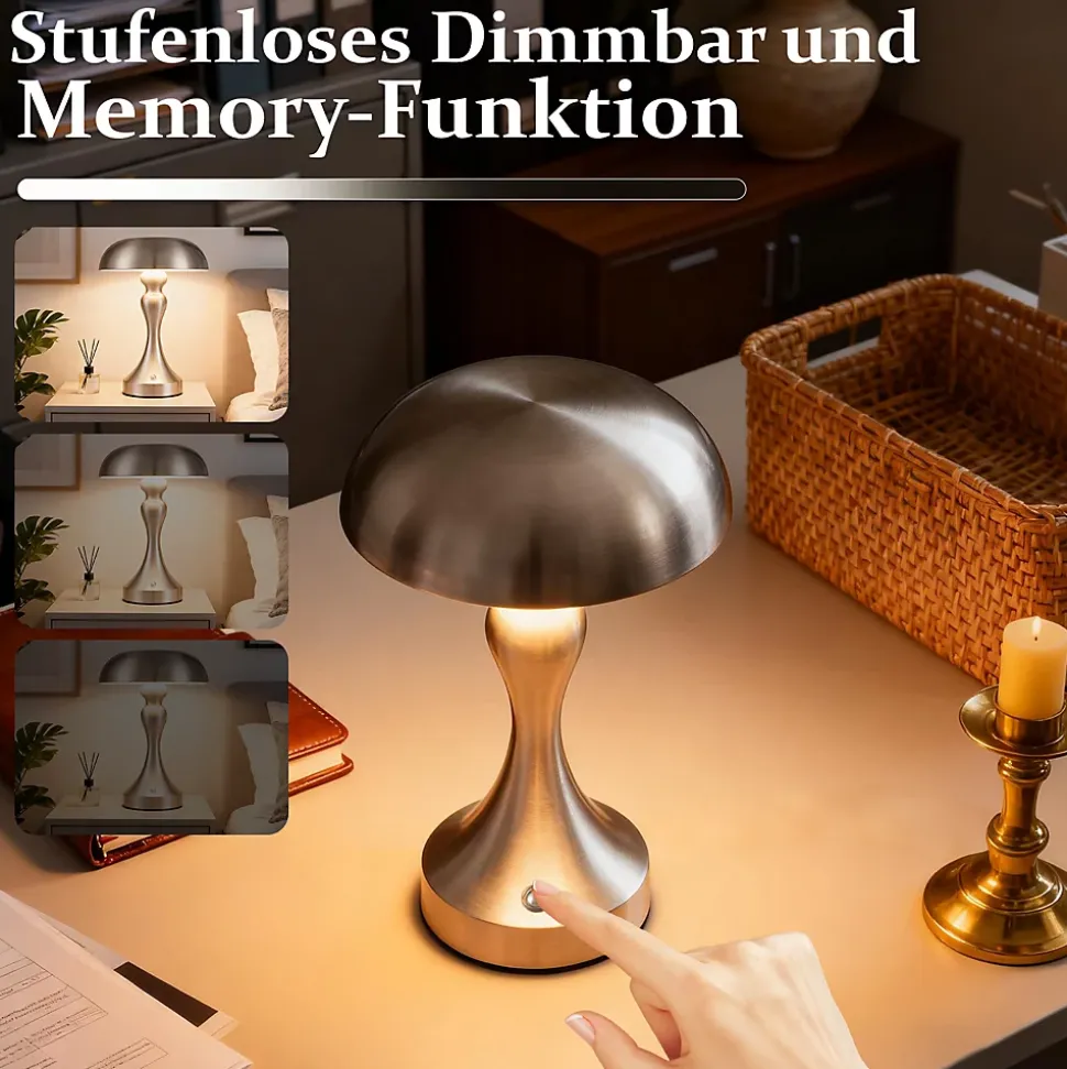 Contrôle tactile facile : cette lampe de table LED est équipée d’une fonction tactile conviviale qui vous permet de régler la couleur de la lumière (3000-6500K) et la luminosité (0-100%) d’un simple toucher. Parfait pour ajuster la lumière à vos besoins.Portable et rechargeable : la lampe à batterie rechargeable peut également être utilisée pendant la charge. Une fois chargé, vous pouvez l’utiliser de manière flexible et pratique n’importe où dans la maison. Un éclairage de secours idéal pour les situations d’urgence.Lampe de chevet LED efficace : avec une batterie au lithium intégrée de 1800 mAh, la lampe fonctionne jusqu’à 6 heures après une charge complète. La charge ne prend que 3 heures, grâce au câble de charge USB Type-C inclus.Utilisations polyvalentes : cette lampe champignon à piles s’intègre parfaitement dans n’importe quel environnement, que ce soit dans la chambre, le salon, la salle à manger ou même dans un bar. Le design rétro crée une atmosphère unique.Conception portable classique : avec une hauteur de 22 cm, il s’adapte à n’importe quelle table et armoire. Disponible en trois couleurs (nickel, bronze rouge et bronze doré), il peut s’adapter à différents styles de votre maison.