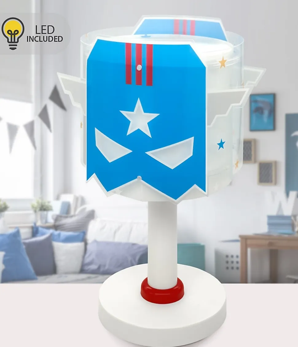 Lampe de table pour enfants Blue Hero. Éveillez votre courage et votre imagination avec ce super-héros et transformez chaque nuit en une aventure épique. Fabriqué avec double écran en polypropylène transparent. Brille dans le noir !