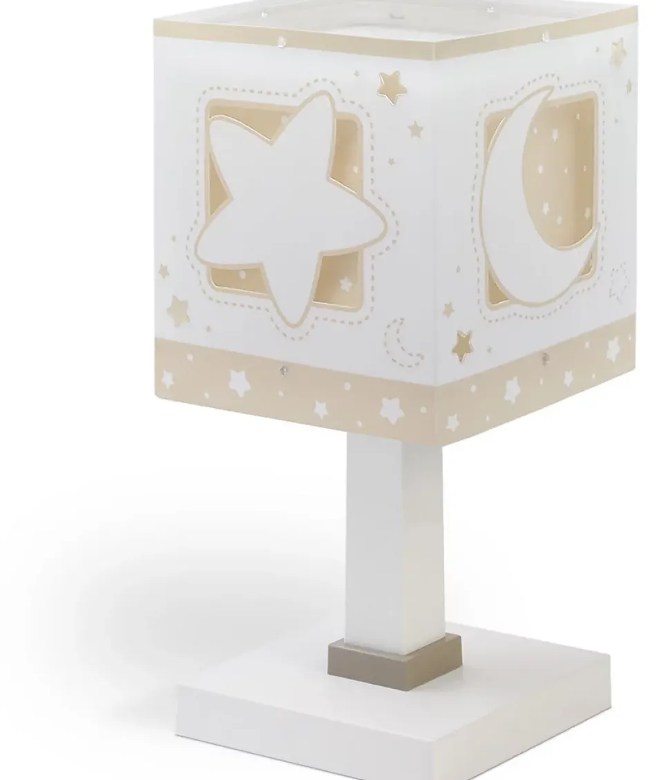 Lampe de chevet bébé fille Moonlight beigeLa lampe de chevet pour bébé fille Moonlight en beige est idéale si vous souhaitez donner un look original à la table de chevet de vos petits. Avec ses lunes et ses étoiles il deviendra un élément de décoration qui apportera une touche très originale à votre pièce. De plus, il apportera de la lumière aux moments où les plus petits jouent, lisent ou juste avant de s’endormir. Il est fait de polypropylène transparent.Lampe de chevet phosphorescenteLa lampe de chevet Moonlight est fluorescente dans le noir : lorsque vous l’utilisez, la lumière va recharger l’effet fluorescent, et lorsque vous éteignez la lumière, dans le noir, vous la verrez briller légèrement pendant quelques minutes. Les petits adorent !