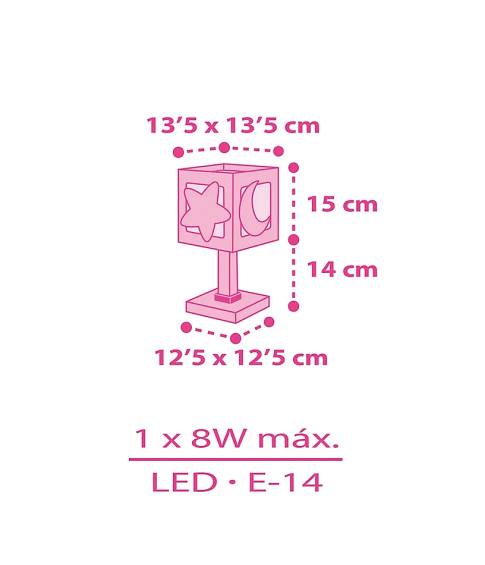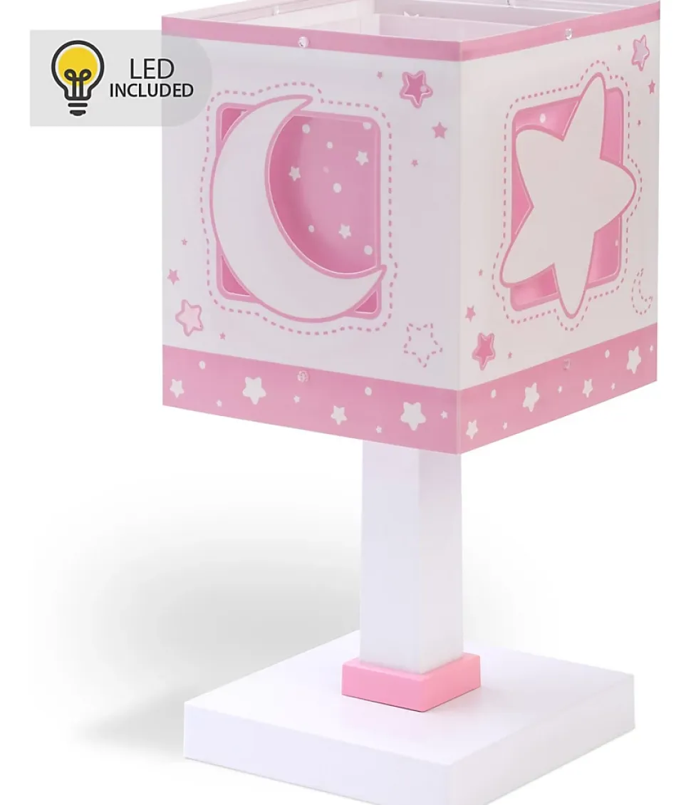 Lampe de chevet bébé fille Moonlight roseLa lampe de chevet pour bébé fille Moonlight en rose est idéale si vous souhaitez donner un look original à la table de chevet de vos petits. Avec ses lunes et ses étoiles il deviendra un élément de décoration qui apportera une touche très originale à votre pièce. De plus, il apportera de la lumière aux moments où les plus petits jouent, lisent ou juste avant de s’endormir. Il est fait de polypropylène transparent.Lampe de chevet phosphorescenteLa lampe de chevet Moonlight est fluorescente dans le noir : lorsque vous l’utilisez, la lumière va recharger l’effet fluorescent, et lorsque vous éteignez la lumière, dans le noir, vous la verrez briller légèrement pendant quelques minutes. Les petits adorent !
