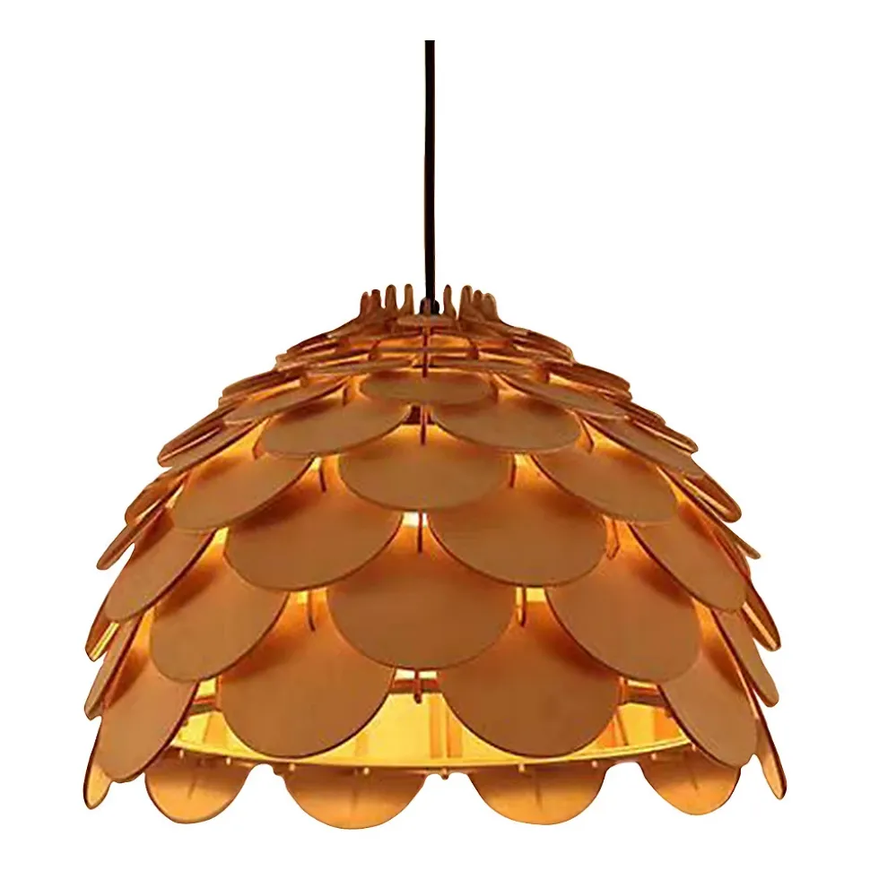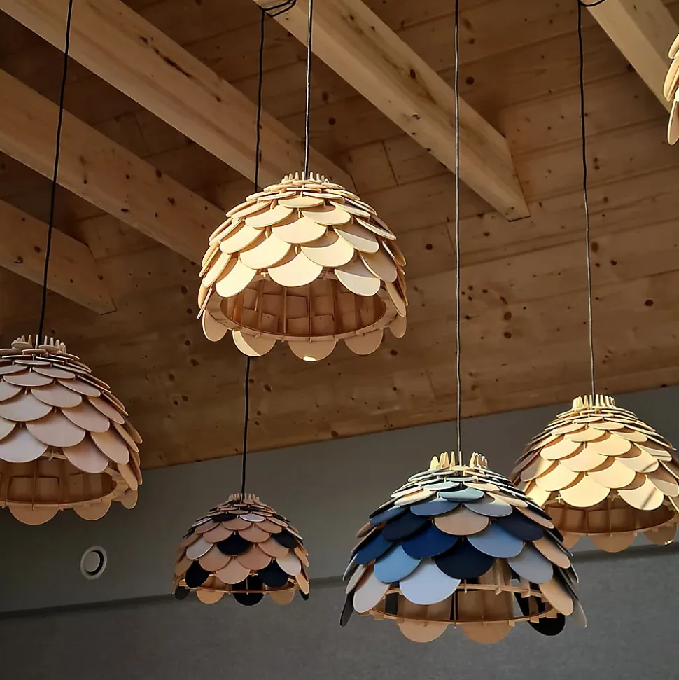 Burgo est une magnifique suspension imposante qui se distingue au premier regard par son design et son style uniques. Son abat-jour est en bois, plus précisément composé de plusieurs fines lamelles de bois superposées, évoquant une écorce d’ananas. Ce luminaire original trouvera parfaitement sa place dans une cuisine ou au-dessus d’une table à manger. Il offre une source de lumière unique et repose sur une structure métallique. La lampe est de couleur bois naturel. Elle s’harmonisera parfaitement avec les pièces à la décoration naturelle, champêtre ou bohème. Elle illuminera à coup sûr les espaces et créera une ambiance chaleureuse. Elle existe également en version plus petite, une excellente nouvelle pour celles et ceux qui rêvent d’une lampe Burgo mais pensaient ne pas pouvoir se l’offrir faute de place.