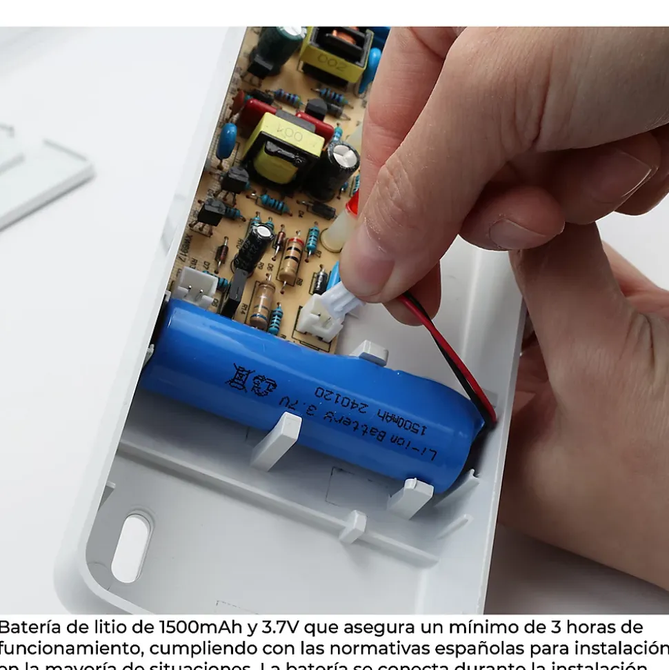 Cette lampe de secours LED garantit un éclairage de secours pendant les coupures de courant, offrant une visibilité dans des situations critiques. Fabriquée en ABS résistant aux chocs, avec un diffuseur en PC offrant une haute transmittance, une flexibilité remarquable et une résistance exceptionnelle, elle est équipée de puces LED SMD2835 pour un éclairage clair et puissant, avec un flux lumineux de 265 lm et une température de couleur blanc froid (6500K). Elle s’allume automatiquement en cas de panne de courant, offrant jusqu’à 3 heures d’autonomie. Un indicateur LED montre son état de fonctionnement (vert) ou la charge de la batterie (rouge). Installation: Encastrée : Remplace les anciennes luminaires ou s’installe dans un nouveau trou, en la fixant facilement à l’aide des ailettes latérales. Surface : Se monte sur le mur ou le plafond, en retirant le cadre pour une installation encastrée. Comprend tous les éléments nécessaires pour le montage. Précautions lors de l’installation : Débrancher l’alimentation pendant l’installation. Ne pas installer à l’extérieur, dans des environnements humides ou corrosifs. Utiliser un circuit d’alimentation indépendant. Vérifier le fonctionnement périodiquement. Charger pendant 20 heures avant la première utilisation. Effectuer une charge et une décharge tous les trois mois si elle n’est pas utilisée. Applications : Magasins, bureaux, écoles, centres de santé, entre autres. Caractéristiques principales : Matériau : ABS Tension nominale : 220-240V AC Lumens : 265lm Installation : Surface ou encastrée Batterie : Li-ion 3.7V 1.5h Couleur : Blanc Température de couleur : Blanc froid (6500K) Indice de protection : IP20 Dimensions surface : 238 x 80 x 37mm Dimensions encastrée : 265 x 106 x 40mm Dimensions de découpe : 250 x 90mm Comprend un kit d’encastrement Installation facile