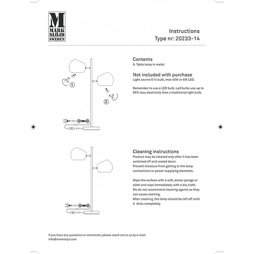 Les caractéristiques techniquesLa lampe de table Edgar noire de Markslöjd est fabriquée en métal noir mat pour une finition élégante et résistante. Elle est équipée de deux têtes orientables permettant de diffuser la lumière vers le haut et vers le bas, offrant un éclairage polyvalent. La lampe mesure 65 cm de hauteur et fonctionne avec deux ampoules E14 d’une puissance maximale de 40 watts chacune (non incluses). Le câble noir de 2 m est doté d’un interrupteur marche/arrêt et d’une prise murale pour une mise en place facile.Les avantages esthétiquesGrâce à ses deux sources lumineuses indépendantes, la lampe Edgar permet de créer une ambiance sur mesure : lumière d’appoint pour la lecture ou éclairage d’ambiance doux vers le plafond. Son design épuré en noir mat lui confère un look exclusif et contemporain, s’adaptant parfaitement à un coin salon, un bureau ou une table de chevet. Disponible également en version laiton antique et en lampadaire pour harmoniser votre décoration intérieure.