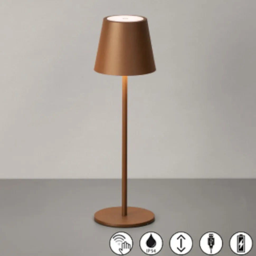 Les caractéristiques techniquesVous aimerez la couleur tendance rouille de cette lampe de table en métal .Elle est dimmable grâce son son bouton tactile et diffuse une lumière de qualité blanc chaud reposante sans aucun effet de scintillement. Elle est rechargeable en USB et vous propose une autonomie de 3,5 heures pour un temps de charge de 3,5 heures.Elle est livrée avec son cordon USB de recharge.Elle est étanche et peut donc fonctionner en extérieur sans aucun risque.Les avantages esthétiquesCette lampe de table autonome d’une esthétique élégante et raffinéee est un véritable produit d’éclairage sans fil performant.Elle diffuse une agréable lumière blanc chaud avec ses 190 lumens. Dimmable, elle vous permet d’ajuster l’intensité lumineuse en fonction de l’ambiance souhaitée.Viletto permet de répondre à vos besoins d’éclairage en l’absence d’alimentation électrique à proximité.Elle se décline en beige, rouille et vert anis.