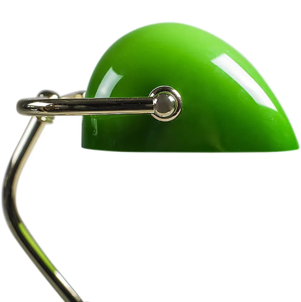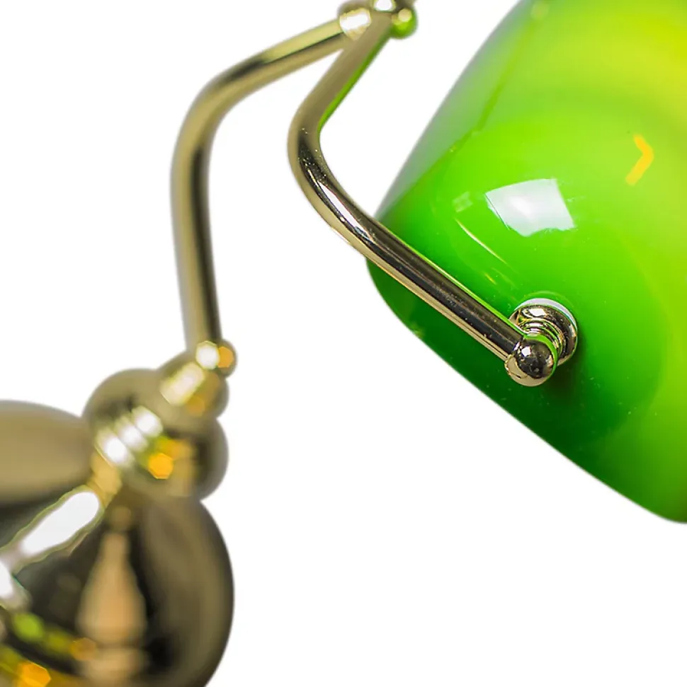Le vrai classique : la lampe de notaire/banquier ! Finition or et vert. Elle se pose parfaitement sur votre bureau pour un effet saisissant. La lampe est équipée d’un culot E27 (60 W maximum) et est livrée sans ampoule. Elle mesure 35 cm de haut et 26,5 cm de large. L’abat-jour en verre mesure 22 cm de long et 13,5 cm de large. Cette lampe classique est dimmable (variateur non inclus) pour une ambiance chaleureuse en soirée ! La lampe est fournie avec un cordon et une prise. Complétez votre bureau ou votre espace de travail avec cette lampe de notaire !