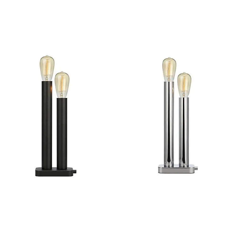 Les caractéristiques techniquesCette lampe de table est en métal laqué noir mat ou chromé.Elle fonctionne avec deux ampoules E27, non fournies ce qui vous permet de choisir température de couleur et intensité lumineuse en fonction de vos goûts et besoins.La lampe Midtown est dotée d’un interrupteur variateur d’intensité lumineuse qui vous permet de choisir votre atmosphère depuis l’ambiance tamisée jusqu’au plein éclairage à condition de l’équiper d’ampoules dimmables. Les avantages esthétiquesSi vous êtes adepte des formes simples et des designs minimalistes, vous aimerez la Lampe de table Midtown imaginée pour MarkSlöjd par le designer Hâkan SvenessonCette lampe est simplement constituée de deux cylindres de métal laqué noir ou chromé posés sur un socle.Eteinte, elle se fond parfaitement dans le décor.Elle trouvera sa place partout où vous souhaitez un point lumineux à la fois efficace et discret.Pour un meilleur rendu esthétique et afin de bénéficier du variateur, nous vous conseillons de choisir des ampoules à filament dimmables.
