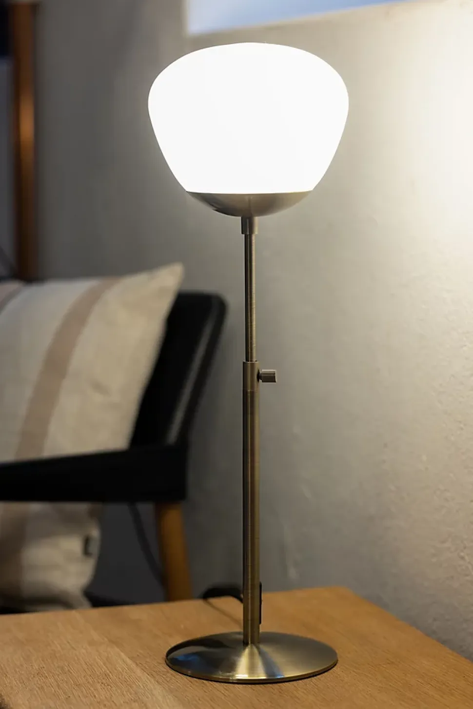Les caractéristiques techniquesLa lampe de table Rise signée Monika Mulder allie raffinement et fonctionnalité. Elle est composée d’un pied en métal finition laiton antique et d’un abat-jour en verre opale pour une diffusion douce de la lumière.Elle fonctionne avec une ampoule à culot E14 de 40W maximum ou une LED équivalente (non incluse). Son câble textile noir de 2 mètres intègre un interrupteur marche/arrêt pour une utilisation facile.Branchée via une prise murale, elle offre un niveau de protection IP20, idéal pour les espaces de vie comme les chambres, salons ou entrées.Les avantages esthétiquesLa collection Rise met en avant des formes douces et un design inspiré du style scandinave. Cette version laiton antique apporte une touche vintage chic à votre décoration intérieure.L’alliance du métal doré et du verre opale crée un luminaire sophistiqué, parfait pour une ambiance chaleureuse et élégante.Grâce à sa hauteur ajustable et à son style intemporel, cette lampe de table s’intègre parfaitement à tous types d’intérieurs, du plus moderne au plus classique.Également disponible en version noire, pour s’adapter à tous les goûts décoratifs.