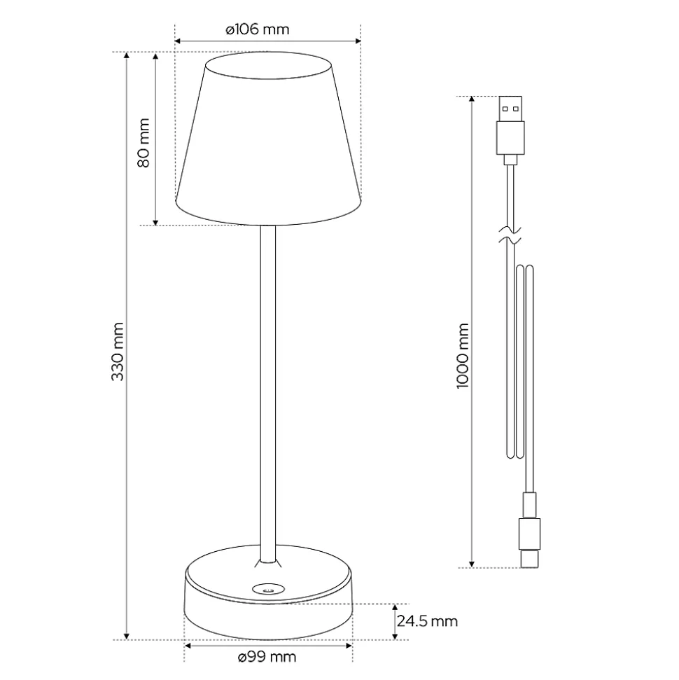 Lampe de table NELI 2,7W LED grise avec batterie 2200mAh IP54 réglage de couleur CCT + RGB 200lm 33cm EDO777720 EDO✔️ La lampe de table NELI est une source de lumière portable que vous pouvez facilement et rapidement recharger à l’aide d’un câble USB.✔️ Facile à utiliser elle dispose d’un interrupteur tactile permettant un réglage progressif de la luminosité ce qui vous permet d’adapter la lumière à votre activité.SPÉCIFICATIONS TECHNIQUES✔️Utilisation : intérieur / extérieur✔️Type de montage : lampe sur pied✔️Couleur : gris✔️Type de finition : mat✔️Matériau : PC, acier✔️Accessoires : câble de recharge USB C✔️Réglable : non✔️Couleur de l’abat-jour : laitier✔️Interrupteur : interrupteur tactile✔️Compatibilité avec un variateur : variation continue✔️IP : IP54✔️Classe de protection : III✔️Puissance en mode marche Pon [W] : max 2,7 W✔️Puissance en mode veille Psb/Pnet [W] : -✔️Tension nominale [V] : CC 5 V / 1 A✔️Couleur de la lumière : CCT + RGB✔️Température de couleur [K] : CCT + RGB✔️Changement de couleur de la lumière : oui✔️Indice de rendu des couleurs CRI : 95✔️Flux lumineux total [lm] : max 200lmDimensions [mm] :✔️largeur de la base : ø99 mm✔️hauteur de la base : 24,5 mm✔️diamètre du diffuseur : ø106 mm✔️hauteur du diffuseur : 82 mm✔️hauteur totale : 330 mm✔️longueur du câble du chargeur : 1000 mm