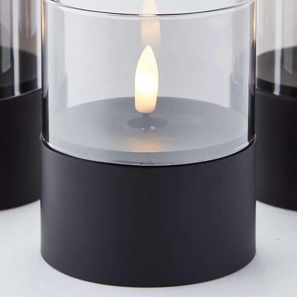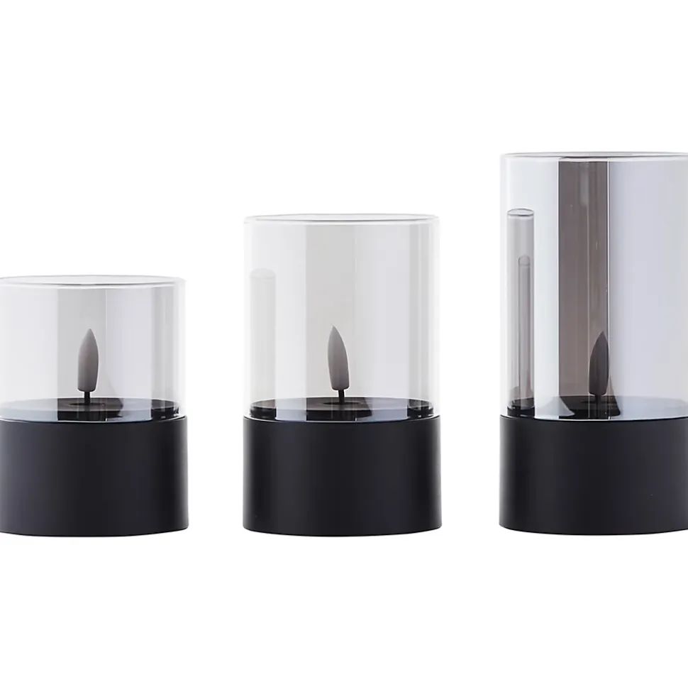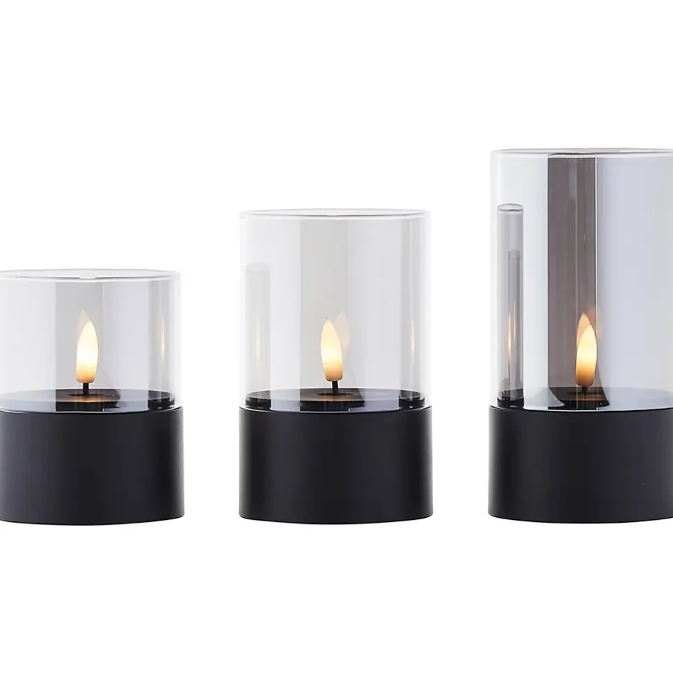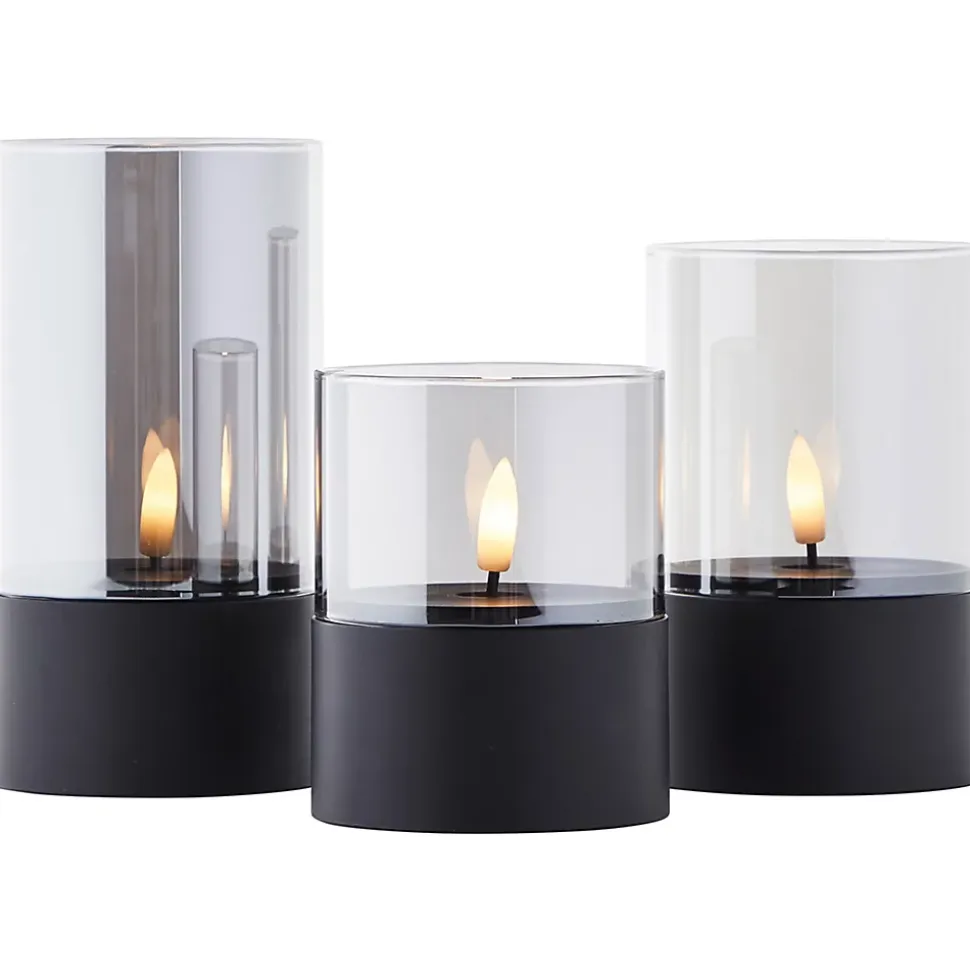 Découvrez notre élégant ensemble de 3 lampes de table BOUGIE avec bougies LED, qui apportent une atmosphère chaleureuse à votre maison à l’intérieur comme à l’extérieur. Avec des hauteurs variées de 10 cm, 12,5 cm et 15 cm, ainsi qu’un diamètre de 8 cm, ces lampes s’intègrent parfaitement sur votre table, votre étagère ou votre rebord de fenêtre. Les bougies LED imitent une douce lueur de bougie, produisant une lumière chaude et douce avec une température de couleur de 2500 Kelvin. Les abat-jours sont en verre fumé moderne, le socle est en plastique noir robuste et avec un indice de protection IP44, elles sont idéales pour la salle de bain ainsi que pour l’extérieur, comme la terrasse et le balcon. Elles constituent le complément idéal et créent une illumination d’ambiance. Grâce à la fonction minuterie pratique, vous pouvez contrôler l’éclairage dans le temps et économiser de l’énergie, car les lampes s’éteignent automatiquement quand vous le souhaitez. Chaque lampe nécessite uniquement 2 piles AA, qui ne sont pas incluses dans l’emballage, ce qui permet de les placer à l’endroit où vous le désirez !