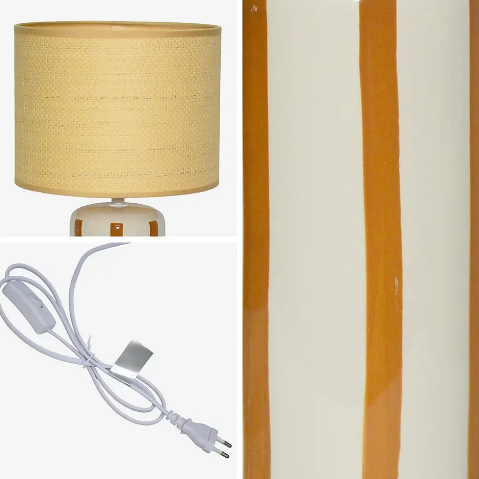 Les + produit : Céramique vernisDesign sobre et tendanceAbat-jour en papier effet rotinAurore, c’est cette lampe qui pose tout de suite une atmosphère douce et élégante dans la pièce. Son design minimaliste réchauffé par de jolies bandes irrégulières vertes ou moutarde selon le modèle, lui donne un petit air artisanal et moderne à la fois. L’abat-jour façon rotin tamise la lumière juste ce qu’il faut pour créer une ambiance apaisante, parfaite en fin de journée. Elle trouve naturellement sa place dans un salon, une chambre ou un coin lecture, et transforme chaque allumage en un petit moment de calme et de confort. Un vrai coup de cœur pour ceux qui aiment les objets simples, beaux et qui font du bien au quotidien.Information complémentaire : Compatibilité : Ampoule E27 (non fournie) – 60W max.Dimensions et caractéristiques :Couleur : Base blanche, motif vert Base blanche, motif moutardeDimensions : Ø23.5 x 43.5 cm (pied : Ø11 x 23 cm et abat-jour : Ø23.5 x 18 cm)Câble de 1.2 m avec bouton on/off à 50 cm du pied (couleur blanc)Secteur max 220-240VCompatible avec les ampoules E27 (non fourni) de max 60WFréquence 50HzProtection IP20Poids net : 1kg