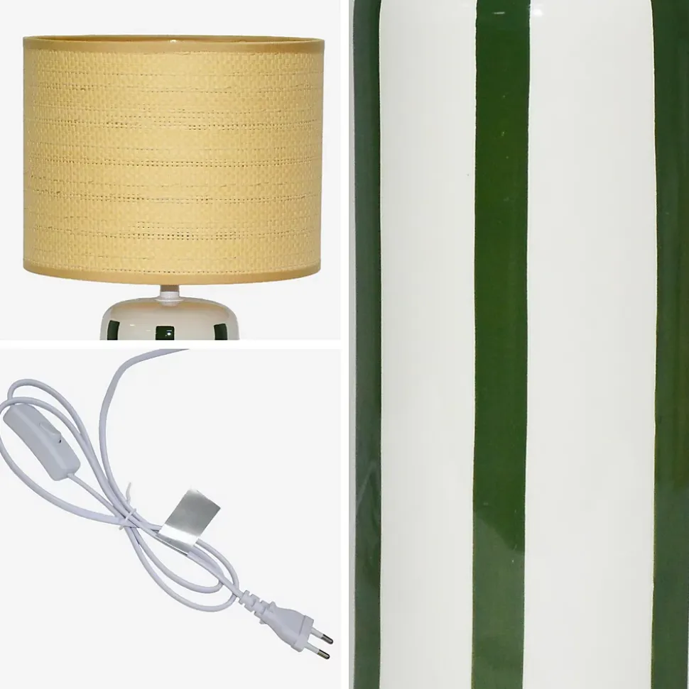 Les + produit : Céramique vernisDesign sobre et tendanceAbat-jour en papier effet rotinAurore, c’est cette lampe qui pose tout de suite une atmosphère douce et élégante dans la pièce. Son design minimaliste réchauffé par de jolies bandes irrégulières vertes ou moutarde selon le modèle, lui donne un petit air artisanal et moderne à la fois. L’abat-jour façon rotin tamise la lumière juste ce qu’il faut pour créer une ambiance apaisante, parfaite en fin de journée. Elle trouve naturellement sa place dans un salon, une chambre ou un coin lecture, et transforme chaque allumage en un petit moment de calme et de confort. Un vrai coup de cœur pour ceux qui aiment les objets simples, beaux et qui font du bien au quotidien.Information complémentaire : Compatibilité : Ampoule E27 (non fournie) – 60W max.Dimensions et caractéristiques :Couleur : Base blanche, motif vert Base blanche, motif moutardeDimensions : Ø23.5 x 43.5 cm (pied : Ø11 x 23 cm et abat-jour : Ø23.5 x 18 cm)Câble de 1.2 m avec bouton on/off à 50 cm du pied (couleur blanc)Secteur max 220-240VCompatible avec les ampoules E27 (non fourni) de max 60WFréquence 50HzProtection IP20Poids net : 1kg