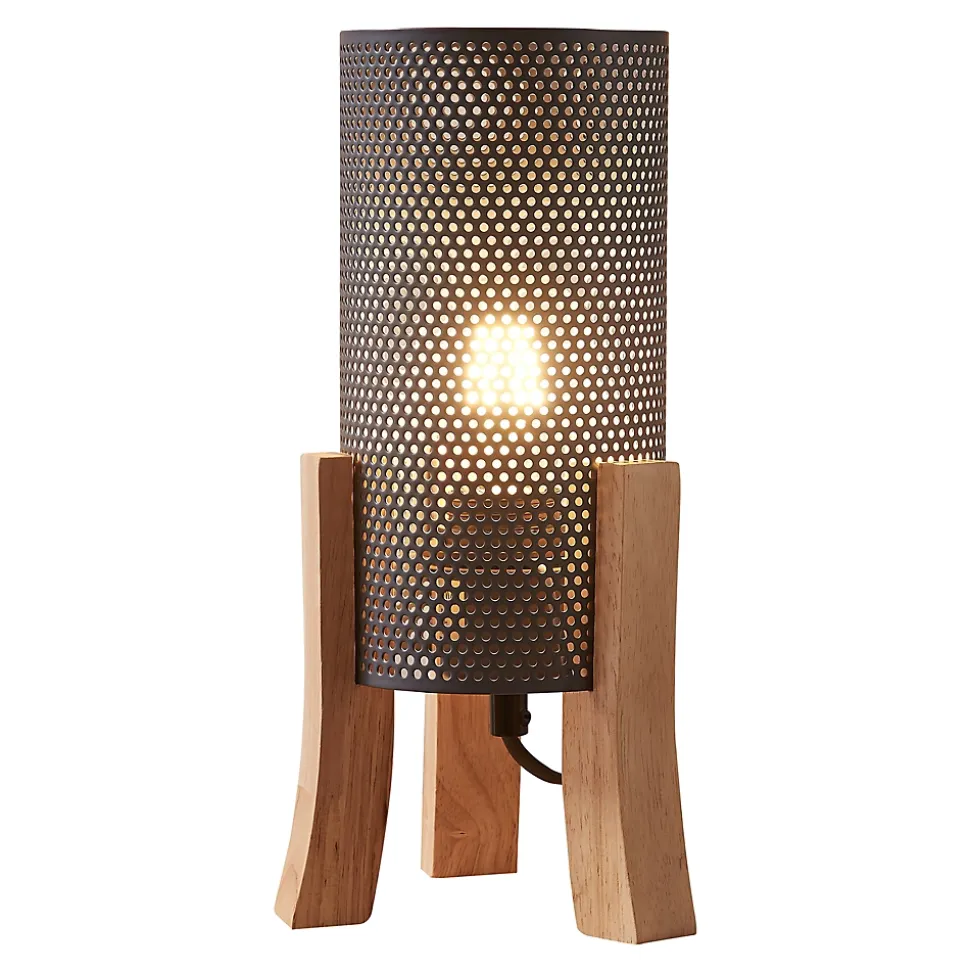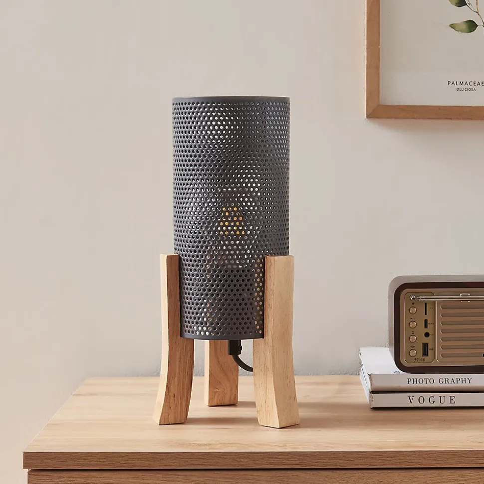 Lampe de tableLampe de table au design chic et intemporel, parfaite pour compléter tout espace de vie ou de travail.Elle trouve aisément sa place comme lampe de lecture sur votre table de nuit et dispose d’un câble suffisamment long qui vous offre des possibilités de positionnement flexibles. Vous pouvez ainsi éclairer votre chambre de manière optimale sans grand effort.La douille de ce modèle élégant est recouverte d‘un abat-jour décoratif, ce qui met encore davantage en valeur son apparence.Points forts du produit :- lampe moderne et stylée pour une ambiance chaleureuse- idéale comme source de lumière supplémentaire dans l’espace de vie- design exceptionnel et attrayant pour chaque maison- éclairage efficace grâce à l’abat-jour métallique à l’aspect maillé- long câble permettant un placement optimal- avec une douille pour ampoules adaptéesCaractéristiques techniques :- douille de lampe : 1 x E27, max. 60W (livré sans ampoule)- tension : 230V, 50Hz- type d’interrupteur : interrupteur intermédiaire à cordon- degré de protection : classe de protection IIDimensions :- totales (h x l x p) : 30 x 14 x 14 cm- abat-jour (h x Ø) : 22 x 11 cm- longueur du câble : 180 cmMatière :- structure : bois- abat-jour : métalCouleur :- structure : couleur bois- abat-jour : grisContenu de la livraison :1 x lampe de table (l’ampoule ne fait pas partie de l’offre)Produit de la marque :lux.pro