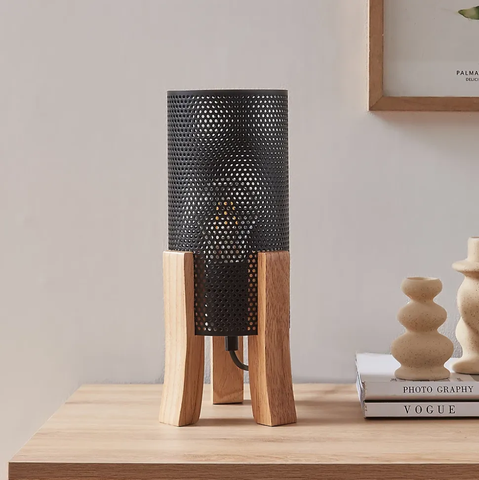 Lampe de tableLampe de table au design chic et intemporel, parfaite pour compléter tout espace de vie ou de travail.Elle trouve aisément sa place comme lampe de lecture sur votre table de nuit et dispose d’un câble suffisamment long qui vous offre des possibilités de positionnement flexibles. Vous pouvez ainsi éclairer votre chambre de manière optimale sans grand effort.La douille de ce modèle élégant est recouverte d‘un abat-jour décoratif, ce qui met encore davantage en valeur son apparence.Points forts du produit :- lampe moderne et stylée pour une ambiance chaleureuse- idéale comme source de lumière supplémentaire dans l’espace de vie- design exceptionnel et attrayant pour chaque maison- éclairage efficace grâce à l’abat-jour métallique à l’aspect maillé- long câble permettant un placement optimal- avec une douille pour ampoules adaptéesCaractéristiques techniques :- douille de lampe : 1 x E27, max. 60W (livré sans ampoule)- tension : 230V, 50Hz- type d’interrupteur : interrupteur intermédiaire à cordon- degré de protection : classe de protection IIDimensions :- totales (h x l x p) : 30 x 14 x 14 cm- abat-jour (h x Ø) : 22 x 11 cm- longueur du câble : 180 cmMatière :- structure : bois- abat-jour : métalCouleur :- structure : couleur bois- abat-jour : noirContenu de la livraison :1 x lampe de table (l’ampoule ne fait pas partie de l’offre)Produit de la marque :lux.pro