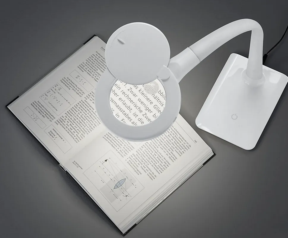 Les caractéristiques techniquesLa lampe de table LED Lupo de TRIO est idéale pour la lecture, les travaux de précision ou le bricolage. Avec son bras flexible et sa fonction de grossissement x3, elle s’adapte parfaitement à vos besoins.Elle intègre une LED SMD de 5W offrant une luminosité de 550 lumens et une température de couleur de 3500K (blanc neutre), idéale pour un éclairage précis et confortable. Son variateur tactile à 4 positions permet d’ajuster facilement l’intensité lumineuse.Les avantages esthétiques et fonctionnelsLe design blanc épuré et compact de la lampe Lupo s’intègre facilement à tous les intérieurs, qu’il s’agisse d’un bureau, d’un atelier ou d’un coin lecture. Son bras flexible permet un positionnement précis de la lumière selon vos besoins.La loupe intégrée avec un grossissement x3 est parfaite pour les travaux minutieux, offrant confort et efficacité au quotidien.Les performances de la technologie LEDLa technologie LED moderne garantit une économie d’énergie jusqu’à 80 % par rapport aux ampoules halogènes classiques. Elle offre aussi une longue durée de vie, produit moins de chaleur et contribue à la protection de l’environnement.
