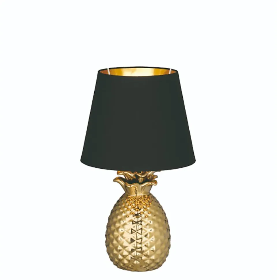 Les caractéristiques techniquesLa lampe de table Led Pineapple est constituée d’un pied en céramique dorée et d’un abat-jour en textile noir.Vous pourrez y adapter une ampoule Led culot E27 d’une puissance maximale de 60 watts pour le grand modèle ou une ampoule Led culot E14 pour le petit modèle. A vous de choisir son intensité et sa température de couleur afin de définir l’ambiance que vous souhaitez.Les avantages esthétiques La lampe à poser Pineapplede Trio a été conçue dans un esprit classique raffiné.Son pied en céramique dorée et son abat-jour en textile noir intérieur doré donneront une touche chaleureuse à votre intérieur.Cette lampe Led a été pensée par les designers de la maison Trio dans un souci d’élégance.Ce luminaire trouvera sa place dans votre salon ou salle à manger. Pineapple existe en deux versions : petit modèle – hauteur 35 cm – culot E14grand modèle – hauteur 43 cm – culot E27