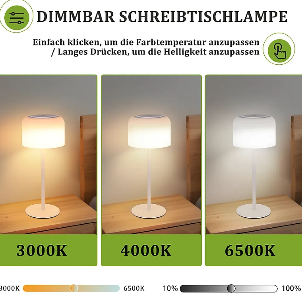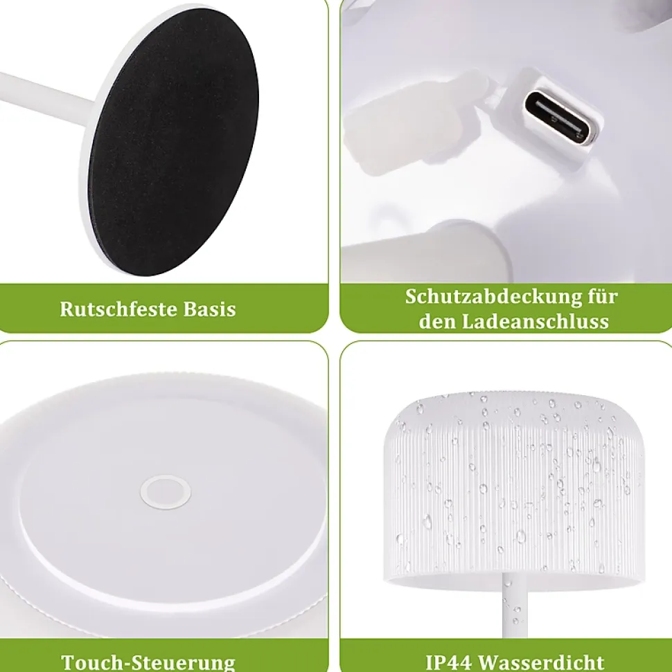 Design : Cette lampe de table LED séduit par son design simple et moderne. Son motif texturé tridimensionnel lui confère une allure tendance. Plus qu’une simple lampe, c’est un véritable accessoire de décoration. Elle s’intègre à tous les espaces intérieurs et extérieurs et apporte une touche d’originalité à votre chambre, balcon, terrasse ou toute autre pièce.3 températures de couleur et gradation continue : Cette lampe de table sans fil offre 3 températures de couleur. Allumez, éteignez et modifiez la température de couleur d’un simple effleurement sur le dessus, du blanc chaud au blanc neutre en passant par le blanc froid (3000K-4000K-6500K). Chaque température de couleur est réglable en continu de 10 % à 100 %, vous permettant de créer facilement l’ambiance lumineuse idéale pour chaque occasion.Éclairage agréable : Cette lampe de table sans fil utilise une source lumineuse LED de haute qualité qui projette la lumière uniformément vers le bas, sans scintillement ni éblouissement, pour un confort visuel optimal. L’interrupteur tactile permet également d’éteindre rapidement la lumière, pour un confort d’utilisation optimal.Chargement USB-C pratique : Cette lampe de table LED sans fil est dotée d’une batterie rechargeable intégrée de 1800 mAh offrant une autonomie de 6 à 10 heures après une charge complète de 3,5 heures, selon le réglage de la luminosité. Libérez-vous des contraintes des lampes de table filaires traditionnelles.Matériau de haute qualité et étanche : Cette lampe de table portable à piles est composée d’un abat-jour en PP de haute qualité, d’une base en métal solide et d’un lampadaire en métal. Durable et esthétique, elle est idéale pour l’éclairage d’ambiance des restaurants, cafés, cuisines, tables de chevet et salles à manger. Elle est également étanche IP44 et dotée d’un joint en silicone pour protéger le port de charge USB-C sous l’abat-jour.