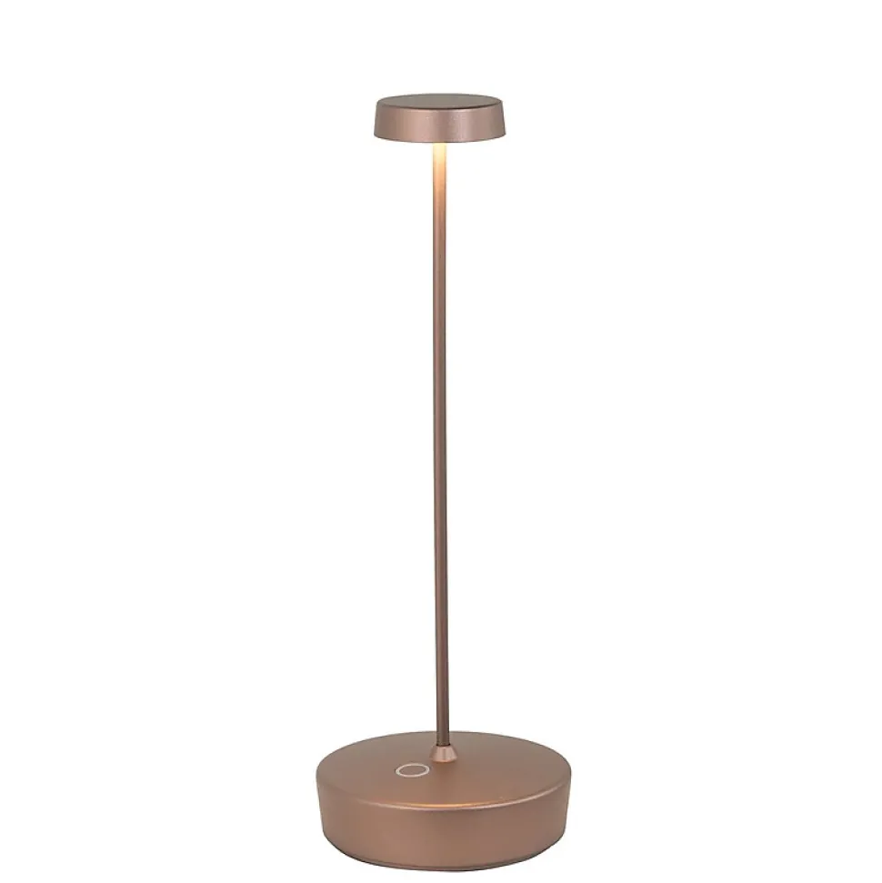 Lampe LED bronze mat de la marque Zafferano (originale), sans fil, alimentée par batterie et avec socle de chargement inclus. Son intensité lumineuse est réglable et offre 3 niveaux de température (couleur de la lumière) : 2200 K, 2700 K et 3000 K (lumière chaude).Foire aux questionsPeut-on l’utiliser à l’extérieur ?Oui, elle est parfaite pour une utilisation en extérieur !Grâce à son indice de protection IP65, la lampe résiste à la poussière et aux projections d’eau. Vous pouvez l’utiliser sur les terrasses, les balcons, les jardins ou même près de la piscine sans craindre de dommages.Comment allumer et éteindre la lampe ?Tout se contrôle d’un simple toucher !Le socle est équipé d’une commande tactile qui vous permet de :• Allumer et éteindre la lampe ;• Régler l’intensité lumineuse sur 3 niveaux.• Sélectionnez la température de couleur de la lumière (2200 K, 2700 K ou 3000 K).Quelle est l’autonomie de la batterie et comment la recharger ?Cela dépend de l’utilisation, mais le système vous préviendra lorsqu’il est temps de la recharger !Le fabricant annonce une autonomie de 13 heures à pleine puissance.La lampe se recharge grâce au socle de contact fourni (remarque : le chargeur n’est pas inclus).Est-elle suffisamment lumineuse ?Oui, elle offre une lumière de haute qualité et réglable.La lampe offre jusqu’à 192 lumens de luminosité, que vous pouvez ajuster selon vos besoins. De plus, son IRC (indice de rendu des couleurs) de 90 garantit des couleurs naturelles et vives. Elle est parfaite pour les dîners romantiques, les lectures en soirée ou pour créer une ambiance parfaite.Est-elle compacte ? Convient-elle aux petits espaces ?Absolument.Avec seulement 29 cm de hauteur et 10 cm de diamètre, cette lampe s’intègre facilement dans les espaces les plus restreints, comme une table basse, une table de chevet ou un coin terrasse