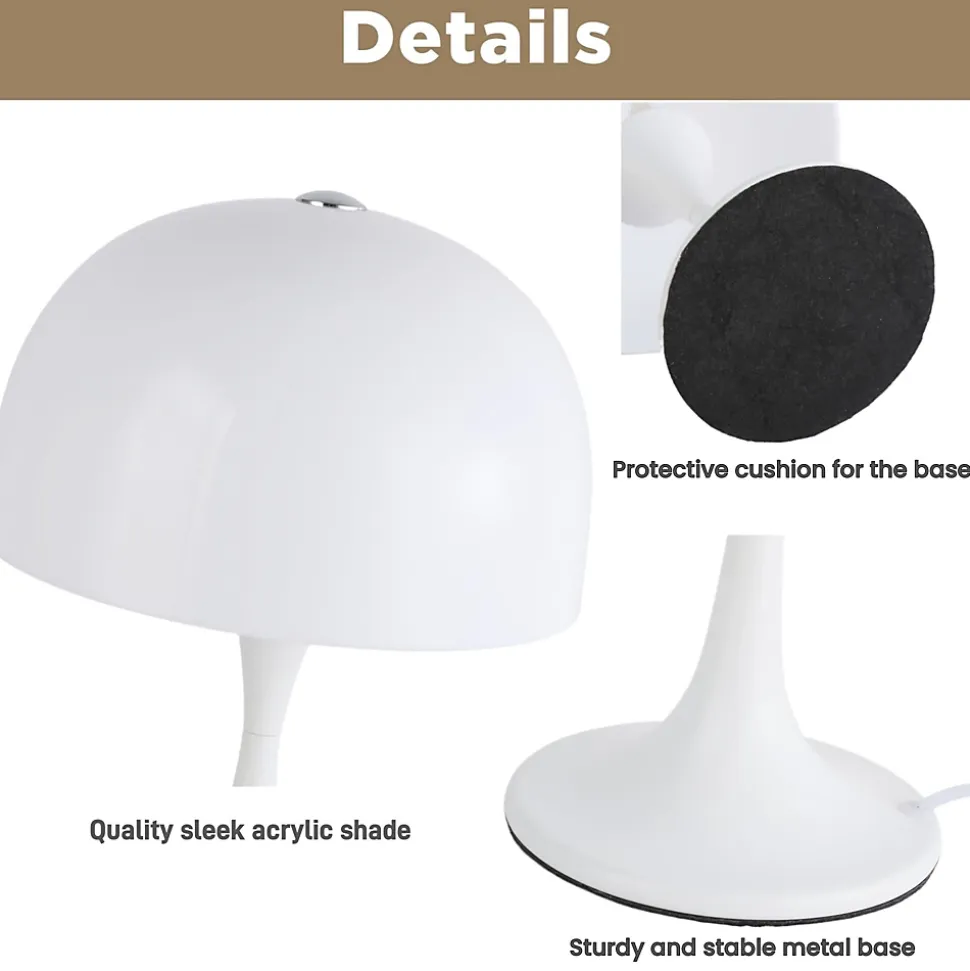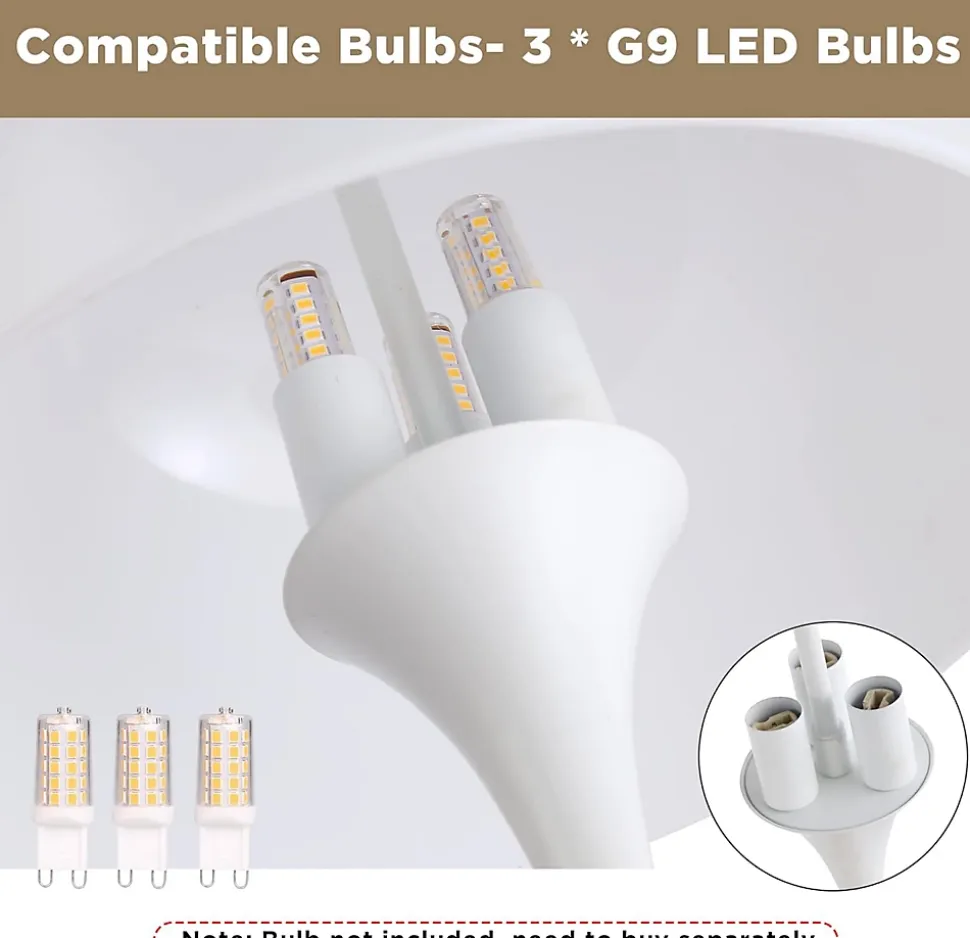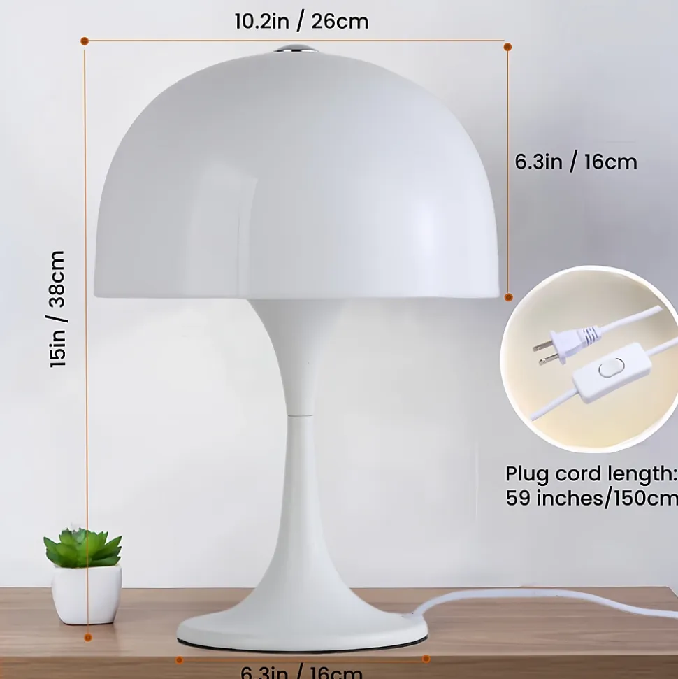 Lampe de table moderne « MEDUSA » avec 3 lumières, abat-jour en verre blanc et base métallique, idéale pour chambre, salon et bureau. G9*3Description:La lampe de table « MEDUSA » combine un design moderne et élégant avec une touche charmante en forme de champignon. Sa base métallique, peinte avec une finition métallique de haute qualité et en forme de trompette, améliore le reflet de la lumière, créant une ambiance chaleureuse et accueillante. L’abat-jour en acrylique blanc translucide diffuse une lumière douce et homogène sans éblouissement, idéale pour n’importe quel espace.Cette lampe polyvalente actualise votre chambre, salon, bureau ou toute autre zone commune avec sa forme organique et son éclat lumineux. Parfaite pour les bureaux, les tables d’appoint ou les tables de chevet, son design élégant n’offre pas seulement de l’éclairage mais aussi une touche décorative qui capte l’attention et crée une atmosphère chaleureuse.Caractéristiques principales :Design unique et attrayant : Base métallique conique en forme de trompette qui améliore le reflet de la lumière, et abat-jour en acrylique blanc translucide offrant un éclairage doux.Éclairage fonctionnel : Avec 3 supports de lampe G9 (non inclus) fournissant une lumière chaude et diffuse, idéale pour la lecture ou pour créer une ambiance.Taille idéale : Avec une hauteur totale de 38 cm, un diamètre d’abat-jour de 26 cm et une base de 16 cm, elle est parfaite pour les tables d’appoint, les bureaux ou les tables de chevet.Ampoules remplaçables : Compatible avec des ampoules LED G9 jusqu’à 40W, permettant de personnaliser l’intensité de la lumière (ampoules non incluses).Ajoutez une touche moderne, fonctionnelle et accueillante à votre maison avec la lampe de table « MEDUSA », une pièce unique qui combine style et polyvalence pour n’importe quelle pièce.