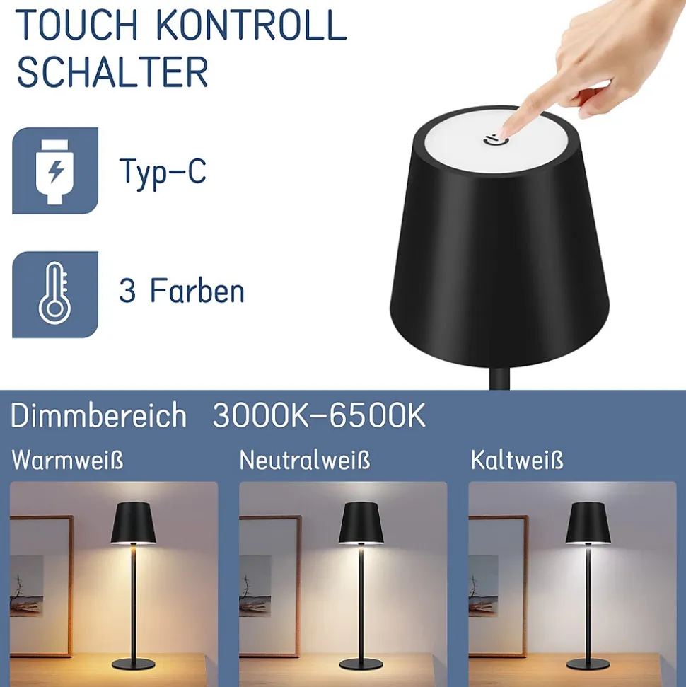 Lampe à batterie tactile et réglable : Cette lampe de table LED tactile et réglable est très simple d’utilisation. Un simple effleurement suffit pour régler la luminosité selon vos besoins. Elle dispose de trois niveaux de luminosité : une pression courte permet de régler la couleur de la lumière (3 000-6 500 K) et une pression longue permet de régler la luminosité (0-100 %).Portable et rechargeable : Cette lampe à batterie rechargeable offre deux utilisations : elle peut être ouverte et utilisée pendant la charge. Une fois chargée, débranchez le port USB et utilisez-la partout dans la maison. Polyvalente et pratique, elle peut également servir d’éclairage de secours en cas d’urgence.Lampe de chevet LED performante : Cette lampe de table LED sans fil est dotée d’une batterie au lithium intégrée de 2 600 mAh qui offre une autonomie de 9 heures après une charge complète (selon la luminosité). Elle est équipée d’un câble de charge USB Type-C. Une charge complète ne prend que 3 heures, vous permettant d’utiliser la lampe de table sans souci.Large gamme d’utilisations : Cette lampe de jardin à piles peut être placée dans la chambre, le salon, la salle à manger, le bureau, mais aussi sur le balcon, la cour et le couloir. Vous pouvez l’utiliser pour lire et écrire, ou la décorer dans les bars et les fêtes pour créer une ambiance chaleureuse.Design portable classique : Cette lampe de table présente un design simple et élégant. Sa hauteur de 37,5 cm s’adapte à toutes les tables, armoires et bars. Cette lampe de bureau d’extérieur LED à piles est étanche IP54, ce qui permet de l’utiliser pour l’éclairage intérieur comme extérieur.