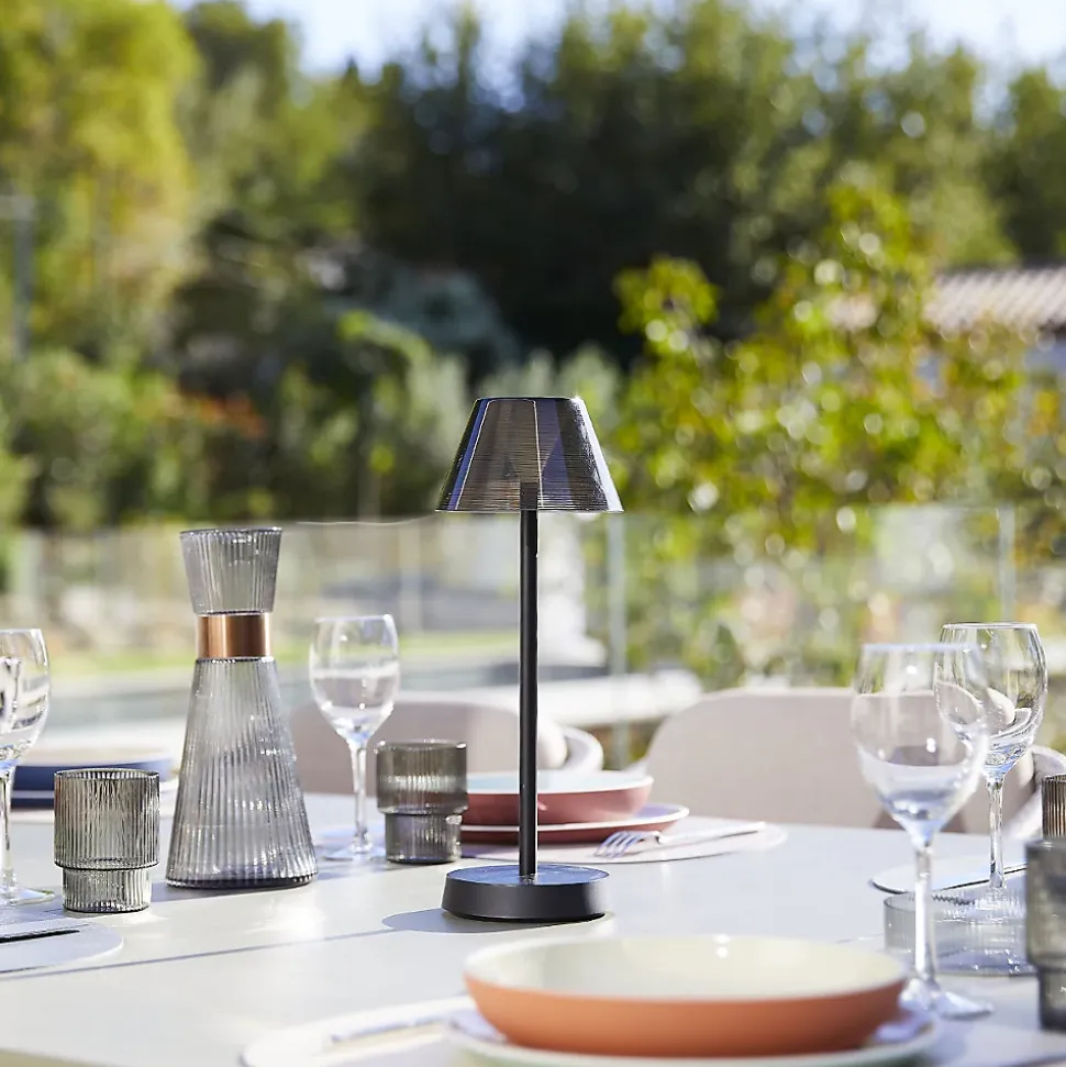 La lampe de table LED sans fil Beverly Black allie un design fin et moderne à une grande praticité d’utilisation pour tous vos espaces. Ce luminaire autonome se compose d’un pied en métal noir robuste et d’un abat-jour en plastique blanc, apportant une touche chic et tendance à votre décoration de salon, de chambre ou de terrasse. Elle mesure 34 cm de hauteur totale pour un diamètre de 13 cm. Grâce à sa batterie rechargeable, elle offre une autonomie de fonctionnement allant jusqu’à 5 heures après une charge complète de 4 heures par câble USB fourni. Son éclairage blanc chaud dispose d’un variateur d’intensité réglable sur 4 positions différentes, vous permettant d’ajuster le flux lumineux de plus de 100 lumens selon l’ambiance souhaitée. Certifiée IP44, la Beverly Black est protégée contre les éclaboussures et résiste aux rayons UV, ce qui la rend idéale pour illuminer vos tables de fêtes en intérieur comme en extérieur avec élégance.
