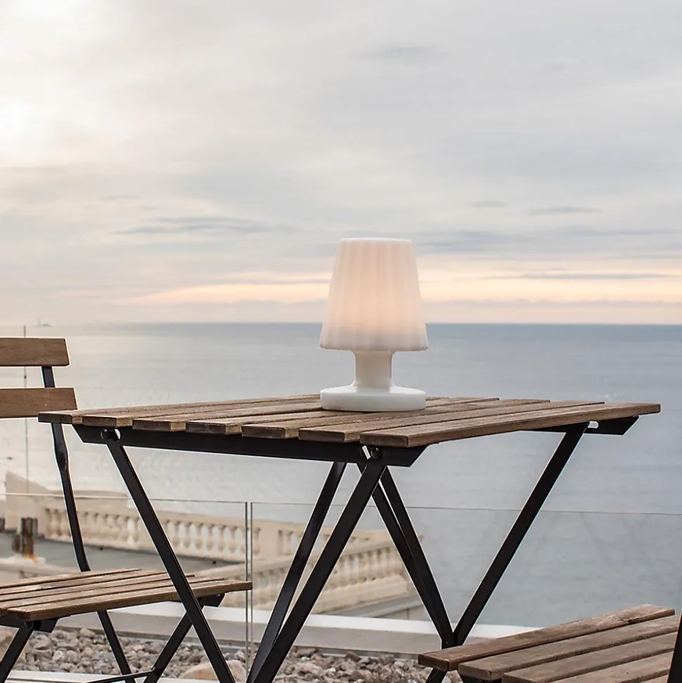 Lampe à poser LED sans fil LUMISKY Lady Mini, compacte et rechargeable, idéale pour usage intérieur et extérieur avec lumière blanc chaud. Design moderne et étanche IP44 résistant aux éclaboussures, autonomie jusqu’à 8 heures, facile à nettoyer.