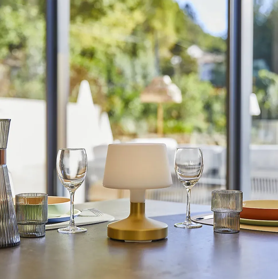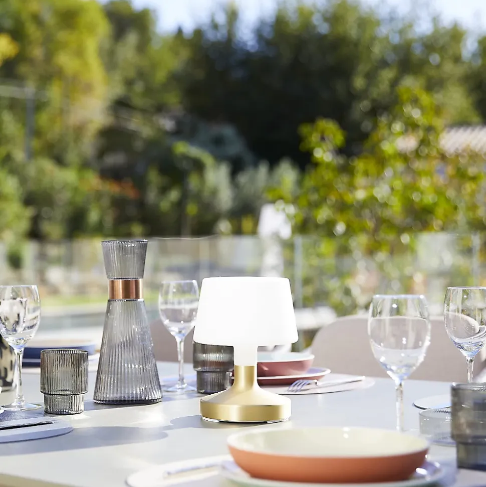 La lampe de table LED sans fil Helen Gold est un luminaire contemporain doté d’un pied tactile en acier doré. Cette lampe nomade propose un éclairage dual blanc chaud et blanc froid pour adapter l’ambiance. Grâce à son variateur d’intensité tactile, gérez précisément le flux lumineux de plus de 100 lumens. Sa batterie rechargeable offre une autonomie de 8 heures après un temps de charge complet de 4 à 6 heures par câble USB. L’abat-jour en polyéthylène associé à une hauteur totale de 21 cm assure une diffusion optimale. Certifiée IP44, elle résiste aux éclaboussures et aux rayons UV pour un usage sur terrasse ou en salon. Son entretien est facilité avec un nettoyage à l’eau tiède. Parfaite pour les repas en plein air, les apéritifs ou les soirées d’été, elle crée immédiatement une ambiance douce et accueillante. Vous pouvez la disposer le long d’une pergola, d’une rambarde ou d’un mur pour structurer la.