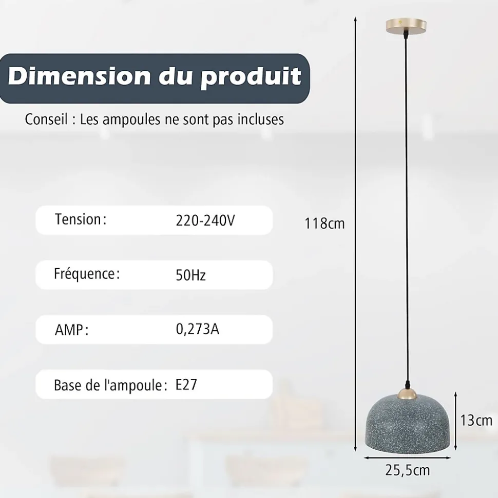 Matériau : MétalDimension totale : 25,5 x 118 cm (Dia x H)Taille de l’abat-jour : 25,5 x 13 cm (Dia x H)Poids net : 0,8 kgTension : 220-240VFréquence : 50HzPuissance maximale compatible : 9W (ampoule LED)/60W (ampoule incandescente)Socle de la douille : Socle standard E27AMP : 0,273A Contenu de la livraison :1 x Lampe suspendue1 x Instructions