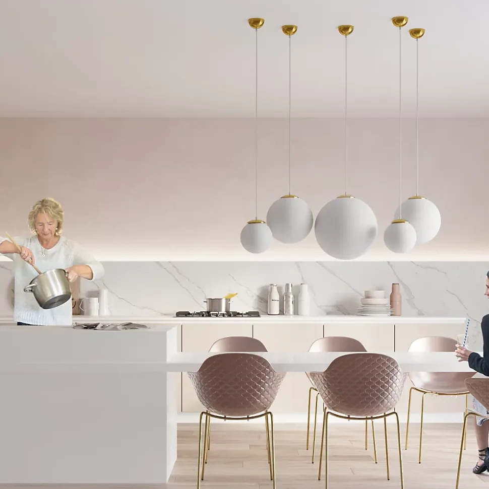 Que la lumière soit ! Et un style parfait. Invitez la suspension STERA dans votre intérieur. Son abat-jour blanc laiteux disperse uniformément la lumière, qui se diffuse dans toutes les directions. La belle forme simple et les accents dorés de la lampe STERA s’intégreront parfaitement dans un salon moderne à l’atmosphère glamour ou dans une chambre minimaliste où vous souhaitez ajouter un peu de chaleur. Choisissez la taille qui convient le mieux à votre intérieur. La collection de lampes STERA comprend des abat-jour en trois tailles. Accrochez-en un ou plusieurs et créez un arrangement cohérent dans toute la maison.
