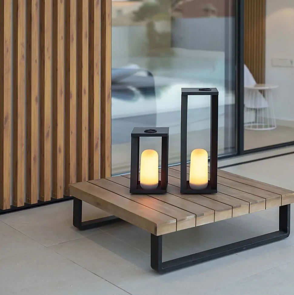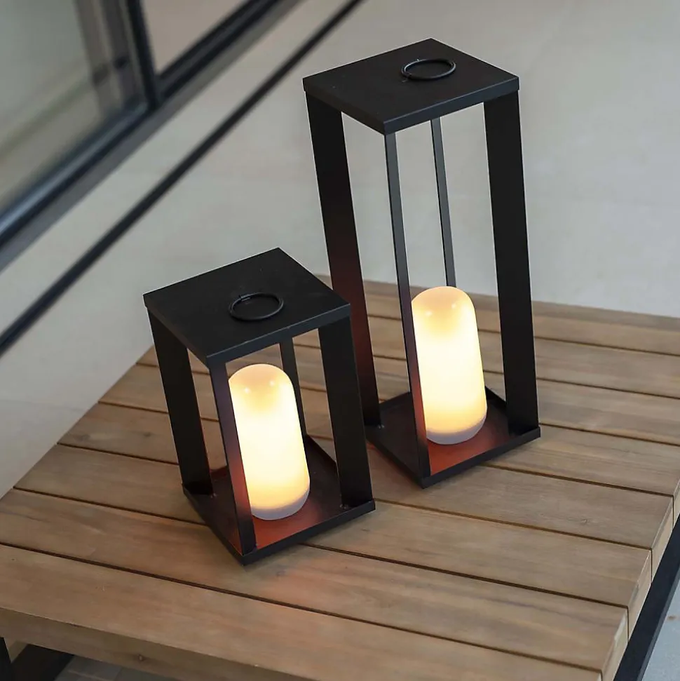 Aspect : Matériau principal = Métal • Dimensions : Hauteur (en cm) = 30 • Longueur (en cm) = 18 • Profondeur (en cm) = 18 • Autres caractéristiques : Informations complémentaires = Ampoule portable rechargeable de 200 lumens , Avec télécommande permettant de l’allumer – de l’éteindre et de régler son intensité , Autonomie de 6 à 20 heures selon son intensité • Poids (en kg) = 1,56 • Lanterne de jardin en métal sur batterie Siroco
