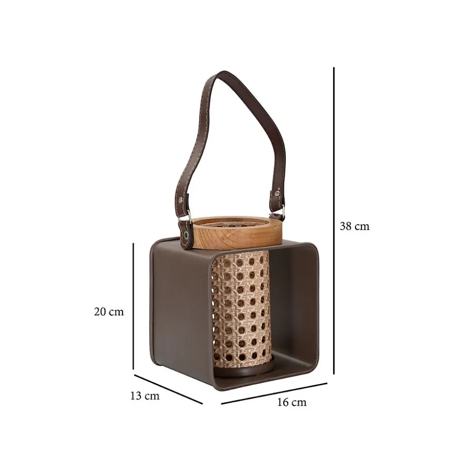 Lanterne en métal et bois, à la forme simple et à la finition soignée rappelant la paille viennoise. Livrée avec une sangle de suspension. Dimensions : 16 x 13 x 20 cm.