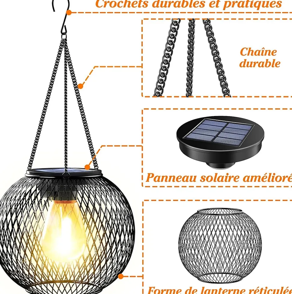 Style rétro:Nos lanterne solaire offre une lumière chaude et un design vintage pour une ambiance relaxante dans votre espace extérieur, idéale pour les soirées.Charge Solaire Efficace :Chaque lampe solaire extérieure est équipée d’une batterie de 800 mAh, ce qui est quatre fois plus puissant que la batterie d’une lampe solaire normale. Cette batterie permet à la lanterne solaire de stocker de l’énergie solaire pendant la journée. Lorsque la lumière du soleil est suffisante, la lanterne d’extérieur s’allume automatiquement la nuit. Une charge complète de 5 à 8 heures offre environ 8 heures d’éclairage.