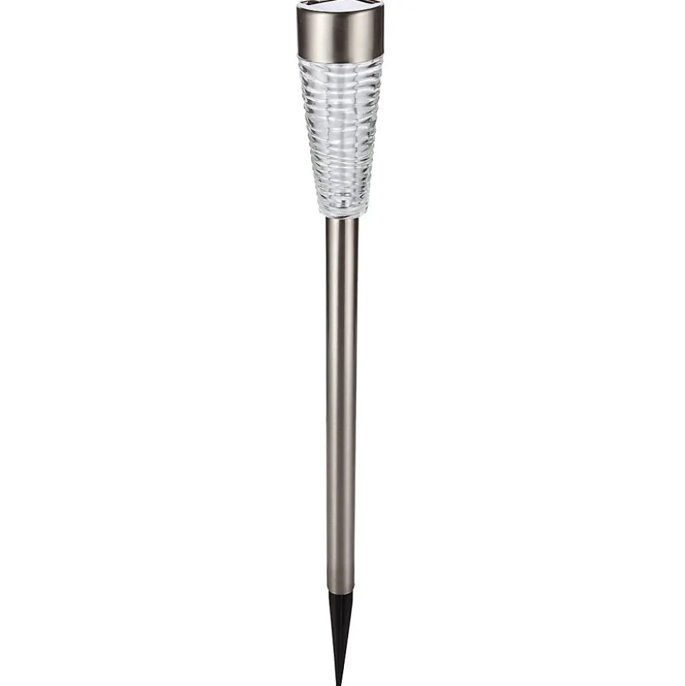 Lanterne solaire en inox H79 avec diffuseur en verre, 1 LED blanche 10 lumens, batterie rechargeable 600mAh incluse, autonomie jusqu’à 8h, IP44, idéale pour baliser allées et terrasses.