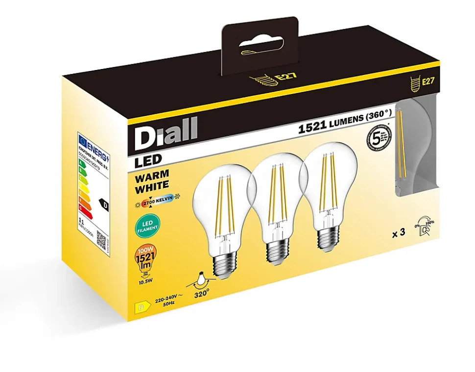Lot 3 ampoules LED à filament GLS E27 1521lm 10.5W = 100W Ø7cm IPX4 Diall blanc chaud