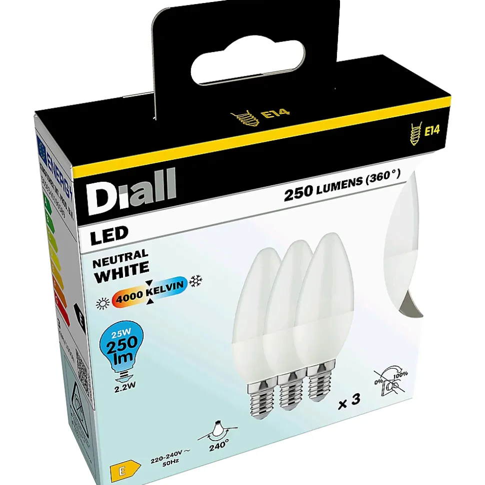 Lot 3 ampoules LED flamme E14 250lm 2.2W = 25W Ø3.5cm Diall blanc neutre