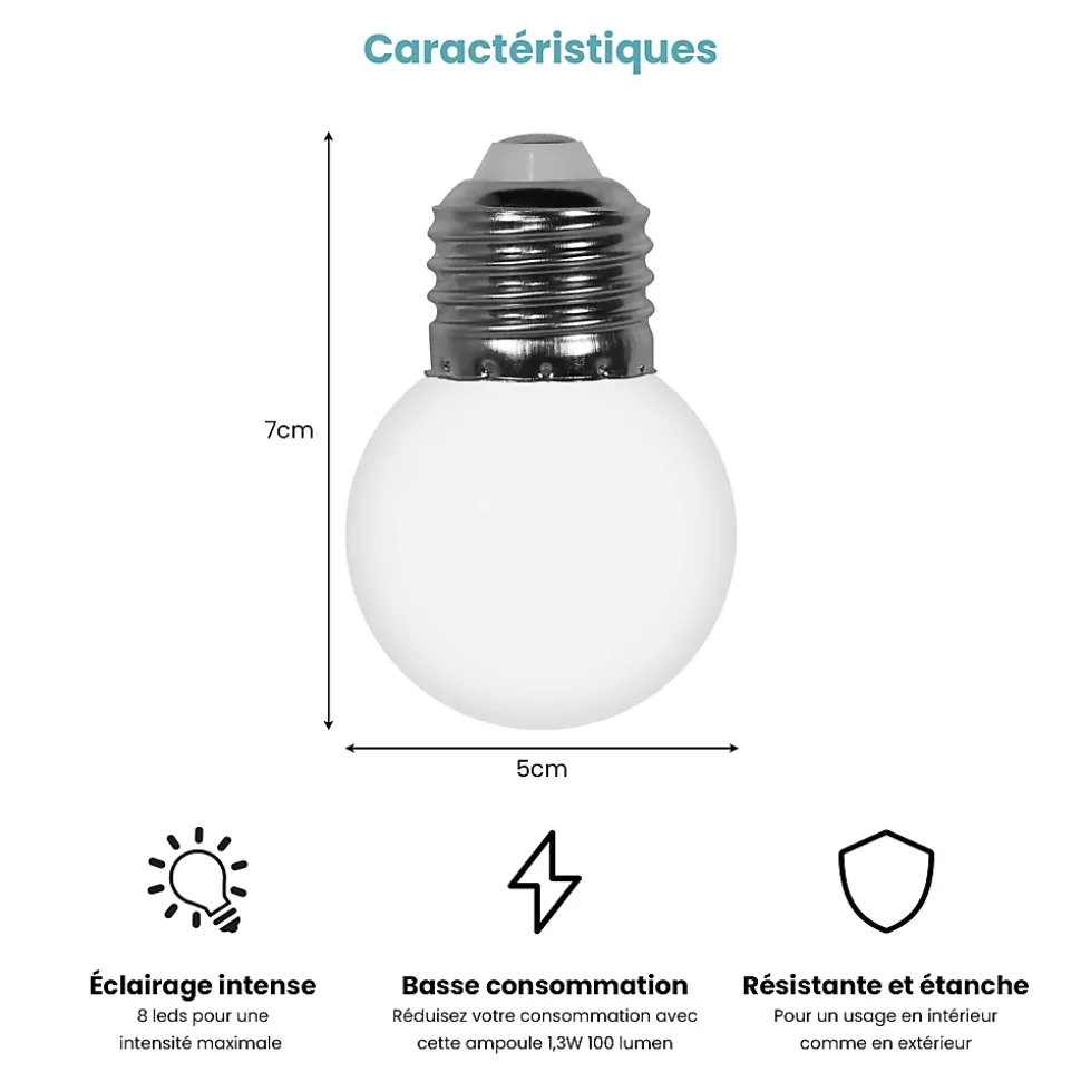 La touche vive et lumineuse indispensable à toute guirlandeAjoutez une touche de couleur à votre guirlande guinguette avec notre lot de 10 ampoules transparentes de 5 cm de diamètre !Avec son culot E27, ces ampoules s’adapteront parfaitement à votre guirlande guinguette SkyLantern.En remplaçant une ampoule cassée ou en personnalisant votre guirlande avec les couleurs de votre choix, vous pourrez créer une ambiance unique pour vos soirées en plein air, votre mariage, vos fêtes de famille ou vos événements professionnels !N’attendez plus pour donner une touche de personnalité à votre guirlande guinguette, et optez pour notre lot de 10 ampoules transparentes pour illuminer vos soirées en extérieur comme en intérieur !Caractéristiques Générales : Ampoule 1,3 W Diamètre : 5 cm Culot E27 Idéale pour nos guirlandes guinguette 10 ampoules