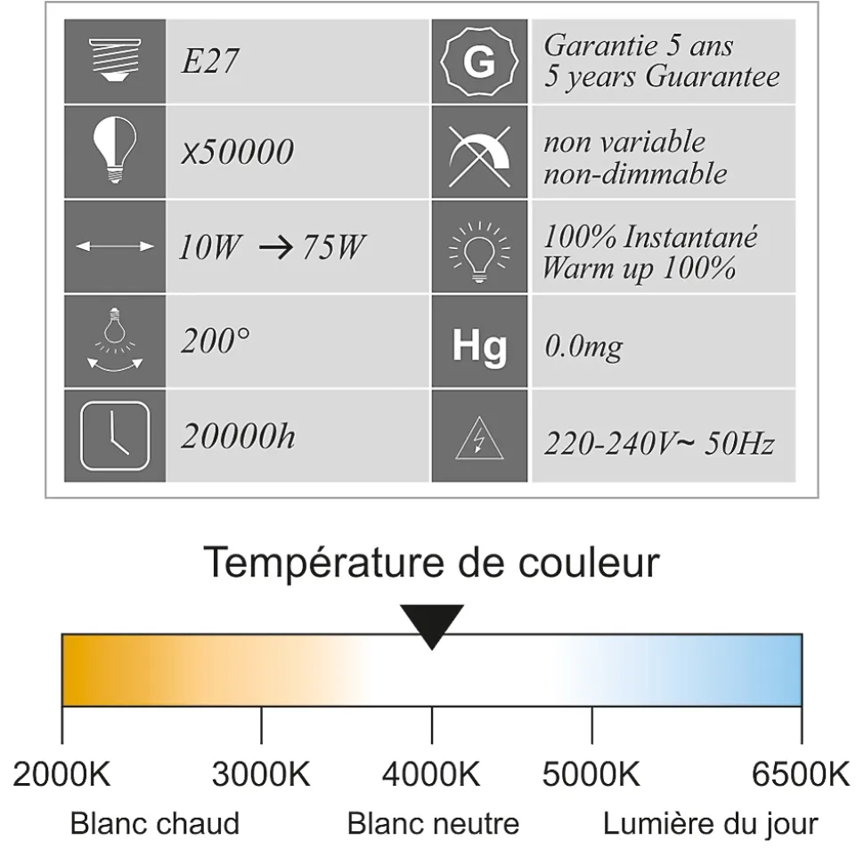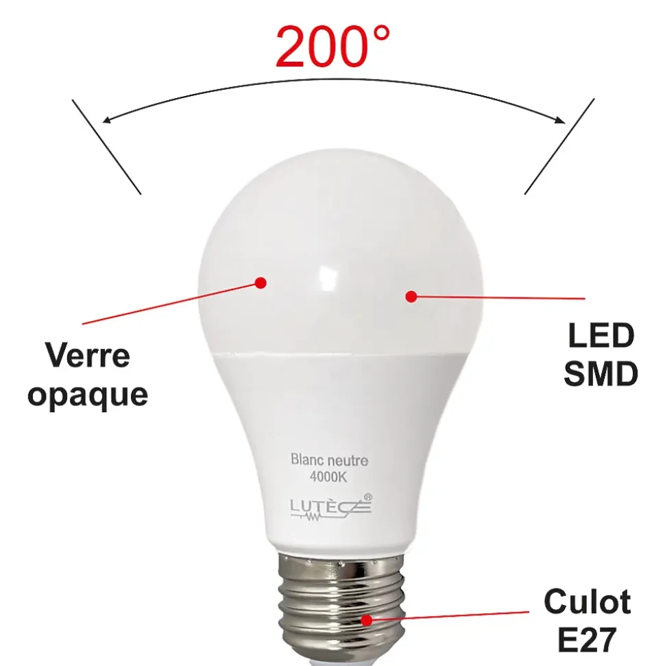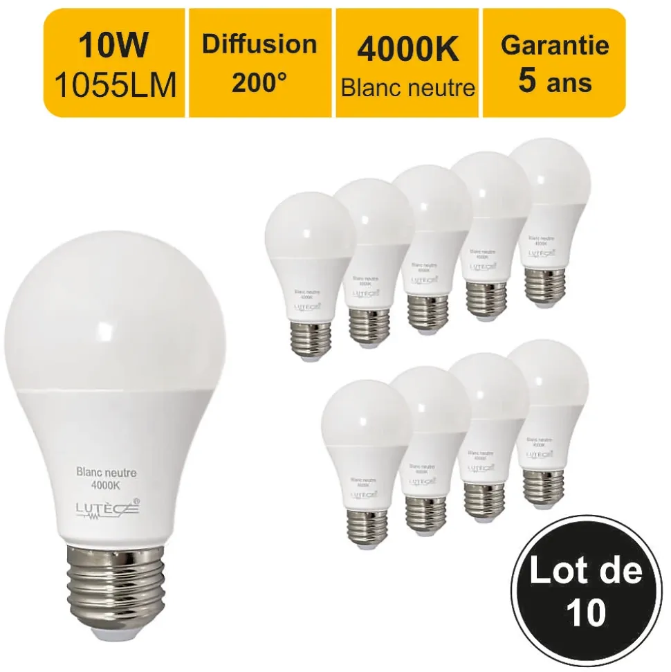 Des ampoules de haute qualité : CE et RoHS approuvés avec 5 ans de garantie.Des économies d’énergie significatives : économisez près de 90% sur votre facture d’électricité de l’éclairage en remplaçant vos ampoules à incandescence de 75 W par ces ampoules LED de 11.1 W.Une durée de vie extrêmement longue de 20 000 heures (vs 1 200 heures pour une ampoule à incandescence) pour un nombre de commutation garanti (ON/OFF) de 50 000.Un angle de faisceau large de 200 degrés, parfait pour un éclairage résidentiel et commercial.Il s’agit d’ampoules LED non réglables, non compatibles avec les variateurs de lumière.Une lumière de 1055 lumens immédiatement, sans temps de chauffe pour atteindre son niveau d’éclairage maximal.Avec une température de couleur de 4 000 Kelvin, l’ampoule fournit une lumière blanc neutre, créant une atmosphère neutreApplications : Les pièces dont le revêtement est clair et dans lesquelles vous souhaitez créer une ambiance chaleureuse ou obtenir un éclairage plus doux comme le salon, la salle à manger, la cuisine, les chambres.Caractéristiques techniques :Nombre d’ampoules : 10 piècesModèle : LED standardForme : Standard A60Culot : E27Type LED : SMDPuissance réelle : 11.1 WattEquivalence ampoule à incandescence : 75 WattAncienne classe énergétique : A+Nouvelle classe énergétique : FEconomie d’énergie : 90%Durée de vie : 20 000 heuresNombre de commutation (ON/OFF) : 50 000Variable / dimmable : nonAllumage : instantanéCouleur : blanc neutreTempérature (en kelvin) : 4 000 KLumen : 1055 LmAngle de diffusion : 200°Verre : opaqueDimensions : 60×112 mmTension : 220-240 VoltGarantie : 5 ansNormes : CE, RoHS