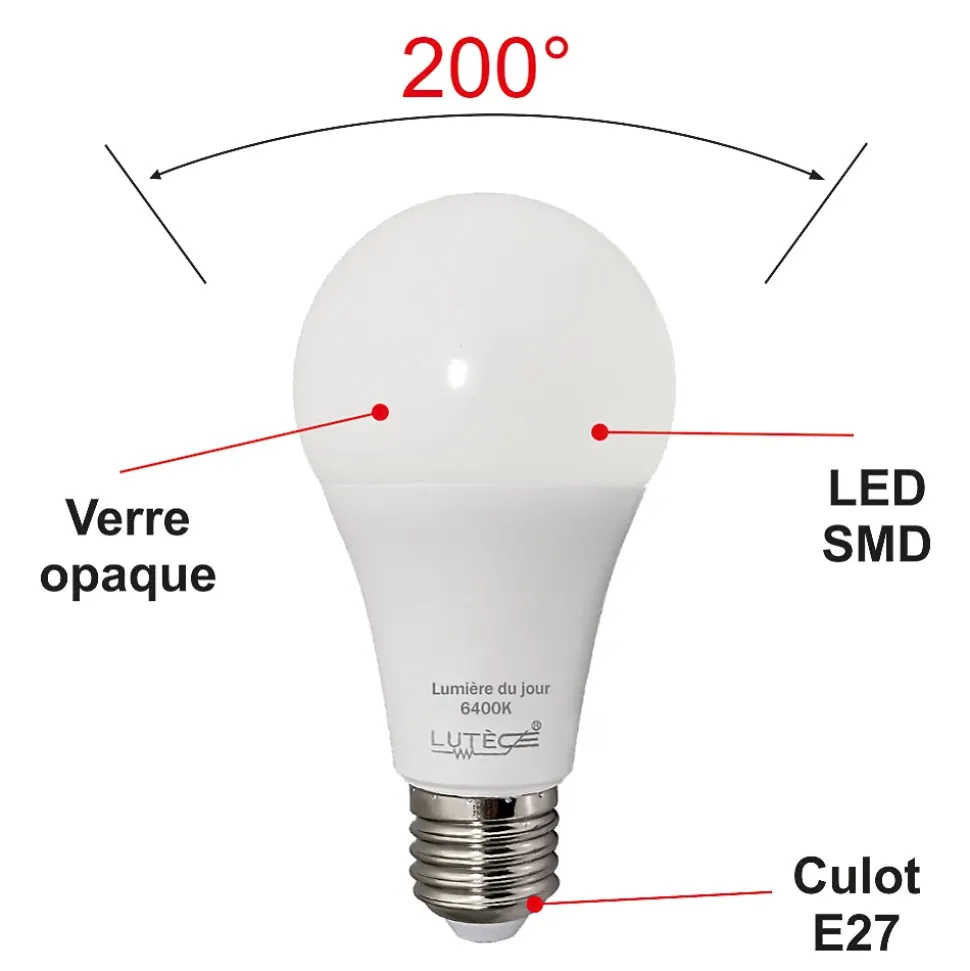 Des ampoules de haute qualité : CE et RoHS approuvés avec 5 ans de garantie.Des économies d’énergie significatives : économisez près de 90% sur votre facture d’électricité de l’éclairage en remplaçant vos ampoules à incandescence de 100 W par ces ampoules LED de 13 W.Une durée de vie extrêmement longue de 20 000 heures (vs 1 200 heures pour une ampoule à incandescence) pour un nombre de commutation garanti (ON/OFF) de 50 000.Un angle de faisceau large de 200 degrés, parfait pour un éclairage résidentiel et commercial.Il s’agit d’ampoules LED non réglables, non compatibles avec les variateurs de lumière.Une lumière de 1521 lumens immédiatement, sans temps de chauffe pour atteindre son niveau d’éclairage maximal.Avec une température de couleur de 6500 Kelvin, l’ampoule fournit une lumière du jour, créant une atmosphère accueillante. Cette couleur d’éclairage est proche de la température d’une lumière produite par une ampoule incandescente ou une ampoule halogène.Applications : Les pièces dont le revêtement est clair et dans lesquelles vous souhaitez créer une ambiance chaleureuse ou obtenir un éclairage plus doux comme le salon, la salle à manger, la cuisine, les chambres.Caractéristiques techniques :Nombre d’ampoule : 10 pièceModèle : LED standardForme : Standard A60Culot : E27Type LED : SMDPuissance réelle : 13 WattEquivalence ampoule à incandescence : 100 WattAncienne classe énergétique : A+Nouvelle classe énergétique : EEconomie d’énergie : 90%Durée de vie : 20 000 heuresNombre de commutation (ON/OFF) : 50 000Variable / dimmable : nonAllumage : instantanéCouleur : blanc chaudTempérature (en kelvin) : 6500 KLumen : 1521 LmAngle de diffusion : 200°Verre : opaqueDimensions : 60×118 mmTension : 220-240 VoltGarantie : 5 ansNormes : CE, RoHS