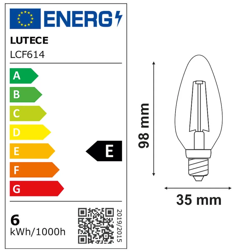 Des ampoules de haute qualité : CE et RoHS approuvés avec 2 ans de garantie.Des économies d’énergie significatives : économisez près de 90% sur votre facture d’électricité de l’éclairage en remplaçant vos ampoules à incandescence de 57 W par ces ampoules LED de 6 W.Une durée de vie extrêmement longue de 20 000 heures (vs 1 200 heures pour une ampoule à incandescence) pour un nombre de commutation garanti (ON/OFF) de 15 000.Un angle de faisceau large de 300 degrés, parfait pour un éclairage résidentiel et commercial.Il s’agit d’ampoules LED non réglables, non compatibles avec les variateurs de lumière.Une lumière de 750 lumens immédiatement, sans temps de chauffe pour atteindre son niveau d’éclairage maximal.Avec une température de couleur de 2 700 Kelvin, l’ampoule fournit une lumière blanc chaud, créant une atmosphère accueillante. Cette couleur d’éclairage est proche de la température d’une lumière produite par une ampoule incandescente ou une ampoule halogène.Applications : Les pièces dont le revêtement est clair et dans lesquelles vous souhaitez créer une ambiance chaleureuse ou obtenir un éclairage plus doux comme le salon, la salle à manger, la cuisine, les chambres.Caractéristiques techniques :Nombre d’ampoule : 10 piècesModèle : LED flammeForme : C35 – flammeCulot : E14Type LED : filamentPuissance réelle : 6 WattEquivalence ampoule à incandescence : 57 WattAncienne classe énergétique : A++Nouvelle classe énergétique : EEconomie d’énergie : 90%Durée de vie : 20 000 heuresNombre de commutation (ON/OFF) : 15 000Variable / dimmable : nonAllumage : instantanéCouleur : blanc chaudTempérature (en kelvin) : 2700 KLumen : 750 LmAngle de diffusion : 300°Verre : opaqueDimensions : 35×98 mmTension : 220-240 VoltGarantie : 2 ansNormes : CE, RoHS