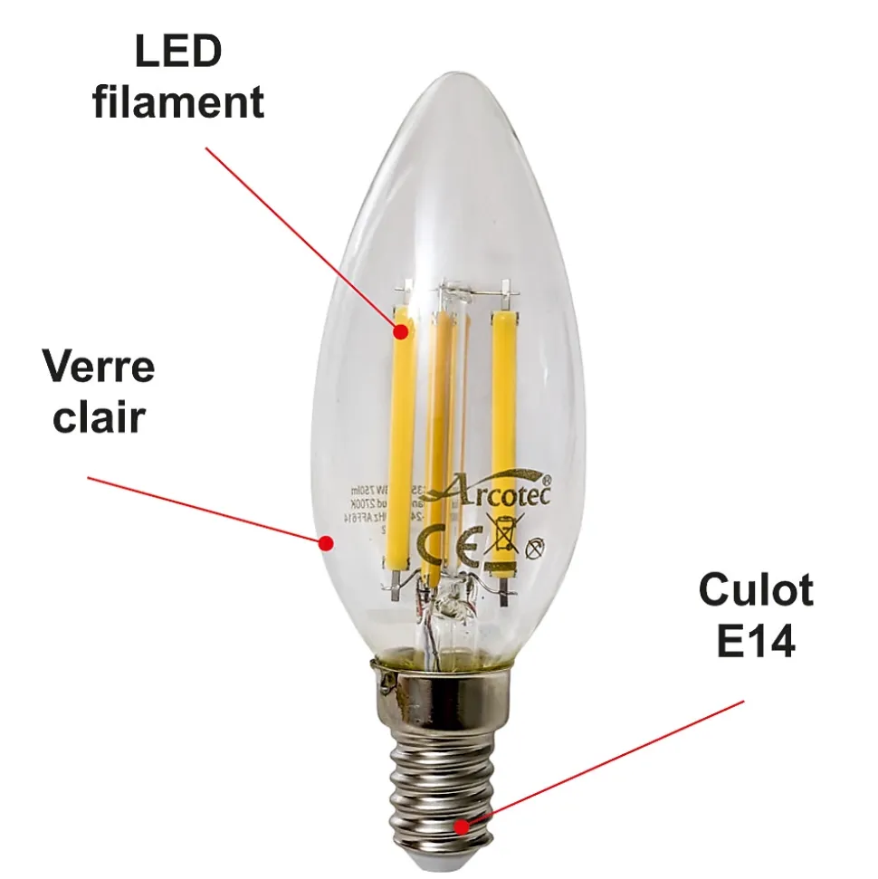 Des ampoules de haute qualité : CE et RoHS approuvés avec 2 ans de garantie .Des économies d’énergie significatives : économisez près de 90% sur votre facture d’électricité de l’éclairage en remplaçant vos ampoules à incandescence de 60 W par ces ampoules LED de 6W.Une durée de vie extrêmement longue de 20 000 heures (vs 1 200 heures pour une ampoule à incandescence) pour un nombre de commutation garanti (ON/OFF) de 15 000.Un angle de faisceau large de 300 degrés, parfait pour un éclairage résidentiel et commercial.Une lumière de 750 lumens immédiatement, sans temps de chauffe pour atteindre son niveau d’éclairage maximal.Avec une température de couleur de 2 700 kelvin, l’ampoule fournit une lumière blanc chaud, créant une atmosphère accueillante dans n’importe quelle pièce.Il s’agit d’ampoules LED non réglables, non compatibles avec les variateurs de lumière.Caractéristiques techniques :Modèle : LED filamentForme : Flamme C37Culot : E14Type LED : filamentPuissance réelle : 6 WattEquivalence ampoule à incandescence : 57 WattAncienne classe énergétique : A++Nouvelle classe énergétique : EEconomie d’énergie : 90%Durée de vie : 20 000 heuresNombre de commutation (ON/OFF) : 15 000Variable / dimmable : nonAllumage : instantanéCouleur : blanc chaudTempérature (en kelvin) : 2 700 KLumen : 750 LmAngle de diffusion : 300°Verre : clairDimensions : 37×98 mmTension : 220-240 VoltGarantie : 2 ansNormes : CE, RoHS