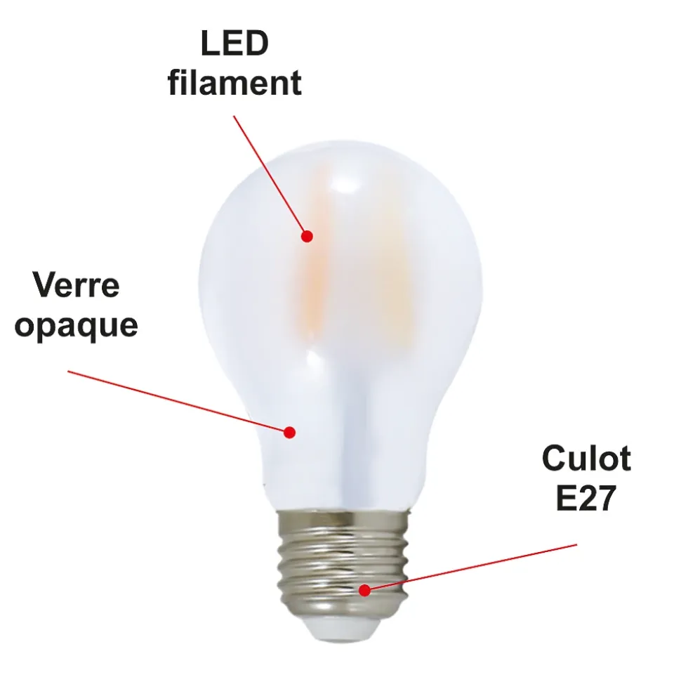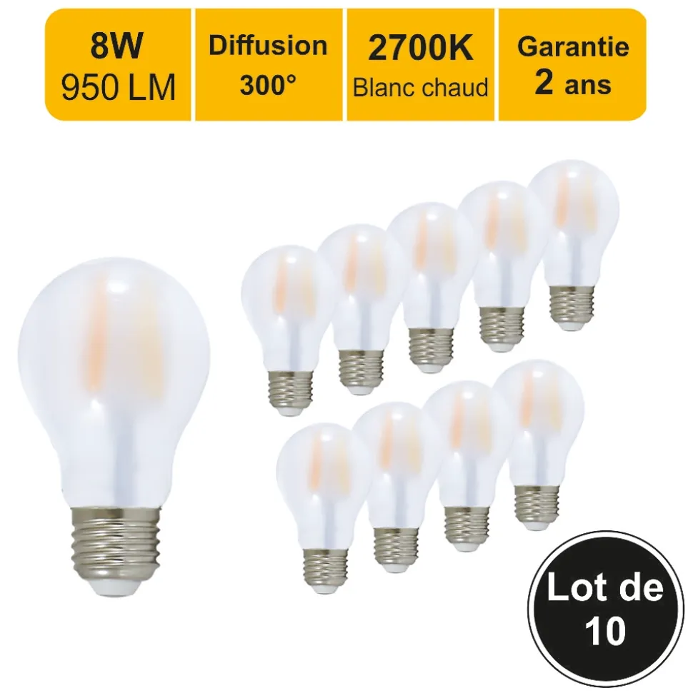 Des ampoules de haute qualité : CE et RoHS approuvés avec 2 ans de garantie.Des économies d’énergie significatives : économisez près de 90% sur votre facture d’électricité de l’éclairage en remplaçant vos ampoules à incandescence de 80 W par ces ampoules LED de 8 W.Une durée de vie extrêmement longue de 20 000 heures (vs 1 200 heures pour une ampoule à incandescence) pour un nombre de commutation garanti (ON/OFF) de 15 000.Un angle de faisceau large de 300 degrés, parfait pour un éclairage résidentiel et commercial.Il s’agit d’ampoules LED non réglables, non compatibles avec les variateurs de lumière.Une lumière de 950 lumens immédiatement, sans temps de chauffe pour atteindre son niveau d’éclairage maximal.Avec une température de couleur de 2 700 Kelvin, l’ampoule fournit une lumière blanc chaud, créant une atmosphère accueillante. Cette couleur d’éclairage est proche de la température d’une lumière produite par une ampoule incandescente ou une ampoule halogène.Applications : Les pièces dont le revêtement est clair et dans lesquelles vous souhaitez créer une ambiance chaleureuse ou obtenir un éclairage plus doux comme le salon, la salle à manger, la cuisine, les chambres.Caractéristiques techniques :Nombre d’ampoule : 10 piècesModèle : LED standardForme : A60Culot : E27Type LED : filamentPuissance réelle : 8 WattEquivalence ampoule à incandescence : 80 WattAncienne classe énergétique : A++Nouvelle classe énergétique : EEconomie d’énergie : 90%Durée de vie : 20 000 heuresNombre de commutation (ON/OFF) : 15 000Variable / dimmable : nonAllumage : instantanéCouleur : blanc chaudTempérature (en kelvin) : 2700 KLumen : 950 LmAngle de diffusion : 300°Verre : opaqueDimensions : 60×105 mmTension : 220-240 VoltGarantie : 2 ansNormes : CE, RoHS