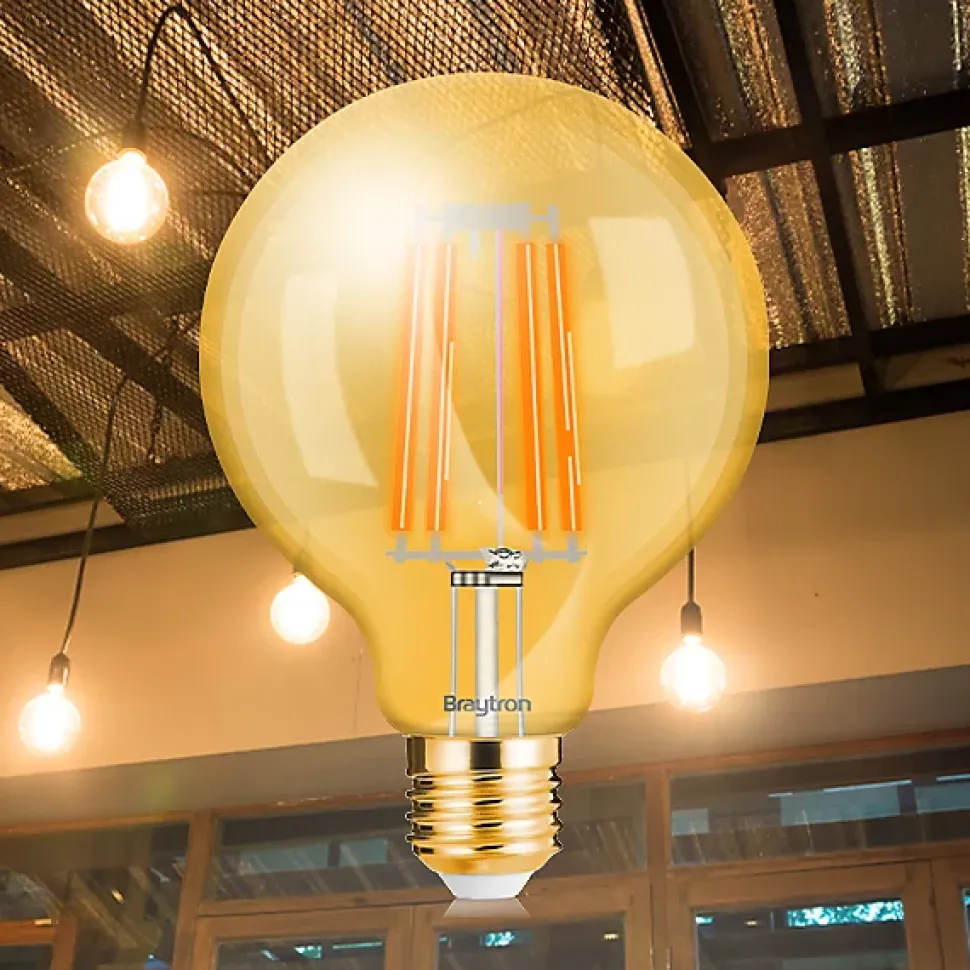 Le lot de 10 ampoules LED G95 filaments 6W E27 2200K Dimmables est constitué d’ampoules aux design rétro, avec les performances des ampoules LED. De plus elles sont esthétiques avec des finitions soignées. Le diffuseur en verre, est légèrement ambré et le culot E27 est doré. Les filaments à LED rappel les filaments incandescents ce qui lui donne un look vintage. Cette ampoule LED G95 filament 6W E27 22000K Dimmable convient à tous types de luminaires mais particulièrement les luminaires suspendus, vintage ou néo rétro, ou l’ampoule est visible. Elle offre une puissance de 6W équivalente à 42W avec une intensité lumineuse de 510lm. De plus, elle est compatible avec un variateur, donc vous pouvez modifier son intensité et tamiser l’éclairage de la pièce. Concernant sa température de couleur kelvin, elle est de 2200K ce qui équivaut à un blanc chaud. Cette température de couleur crée une ambiance chaleureuse. Elle convient donc aux pièces de la maison propices à la détente comme le salon, les chambres. Mais aussi pour créer un espace cosy dans certains locaux commerciaux, comme les restaurants, hôtels, bars etc. Cette ampoule s’adapte à tous types de luminaires dotés d’une douille E27. Cependant, étant un objet design à elle toute seule, cette ampoule LED vintage E27 sera particulièrement mise en valeur montée sur des luminaires suspendus ou l’ampoule est visible. Puissance : 6W Kelvin : 2200K Lumens : 510lm Angle de diffusion : 360° Diamètre : 95mm Hauteur : 125mm Culot : E27 Durée de vie : 15000h Grâce à son rendement énergétique élevé, elle possède une classe énergétique A+. Cette ampoule est conforme à la norme CE, à la directive RoHS et DEEE.