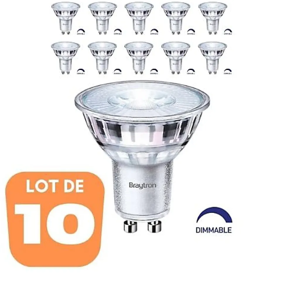Le lot de 10 ampoules LED GU10 5.5W (Eq. 50W) 2700K 38° Dimmable offre un éclairage performant et des économies d’énergie de plus de 80%. Elle sont idéales en remplacement des anciennes ampoules GU10 halogènes, énergivores. En général l’ampoule LED GU10 5.5W est associée à un support de spot rond ou carré encastrable au plafond. Néanmoins elle peut également être utilisée avec d’autres types de luminaires comme des spots sur rails, des suspensions, appliques etc. L’angle du faisceau lumineux est de 38°, c’est un angle moyen qui permet l’éclairage d’accentuation de certaines zones d’une pièce. Sa température de couleur kelvin est de 2700 Kelvin (blanc chaud). Cette couleur d’éclairage créer une atmosphère cosy, propice à la détente et au repos. Le flux lumineux de cette ampoule LED spot est de 350 Lumens. Son diffuseur opaque permet un éclairage sans éblouissement. Son corps est en PC et aluminium. De plus, cette ampoule est dimmable, donc compatible avec un variateur d’intensité. Cette ampoule est également disponible en 4000K (blanc naturel). Température de couleur : 2700K Blanc chaud Puissance : 5.5W Lumens : 350lm Angle faisceau : 38° Dimmable : Oui Culot : GU10 Indice rendu des couleurs (IRC) : 80 Durée de vie : 25000h Hauteur : 53.5mm Diamètre : 50mm Cette ampoule est conforme à la norme CE, à la directive RoHS et DEEE. Grâce à son rendement énergétique élevé, elle possède une classe énergétique A+.
