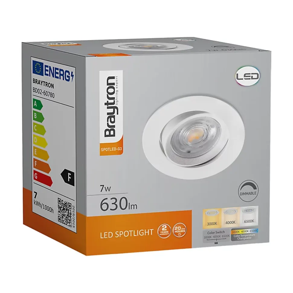 Le spot LED encastrable 3en1 rond blanc 7W IP20 Dimmable à pour particularité son interrupteur de couleur au dos du mécanisme, qui permet de changer sa couleur de température kelvin (3000K, 4000K, 6500K). C’est pour cela qu’il convient parfaitement pour l’éclairage général de la maison (sauf salle de bain). Mais aussi les locaux commerciaux comme les restaurants, hôtels, boutiques, etc.. En effet, le spot LED encastrable 3en1 rond blanc 7W IP20 Dimmable, s’adapte à chaque pièces en fonction de l’ambiance désirée. Avec son driver intégré et ses ressorts de fixation, son installation est simple et rapide. Son efficacité énergétique et sa longue durée de vie permettent plus de 80% d’économie d’énergie, par rapport aux éclairages traditionnels incandescents ou halogènes. Son indice de rendu des couleurs (IRC) est élevé Ra⩾80. De plus il n’émet pas de radiation UV ni infrarouge. Ce spot est dimmable et peut donc être connecté à un interrupteur variateur d’intensité. Cela permet de varier l’intensité de l’éclairage pour le tamiser ou l’intensifier. Ce spot dispose d’un interrupteur de couleur Kelvin permettant de choisir entre 3 températures de couleurs. Le blanc chaud 3000K ambiance convivial et cosy, le blanc naturel 4000K qui se rapproche le plus à la lumière du jour et le blanc froid 6500K qui est énergisant et convient donc pour la concentration. Sa puissance de 7W avec 670lm équivaut à la puissance d’une ampoule incandescente de plus de 60W. Il est orientable et son angle de diffusion est de 38°, considéré comme moyen. Concernant sa matière, il est en polycarbonate (PC), qui est un thermoplastique connu pour ses propriétés mécaniques excellentes entre